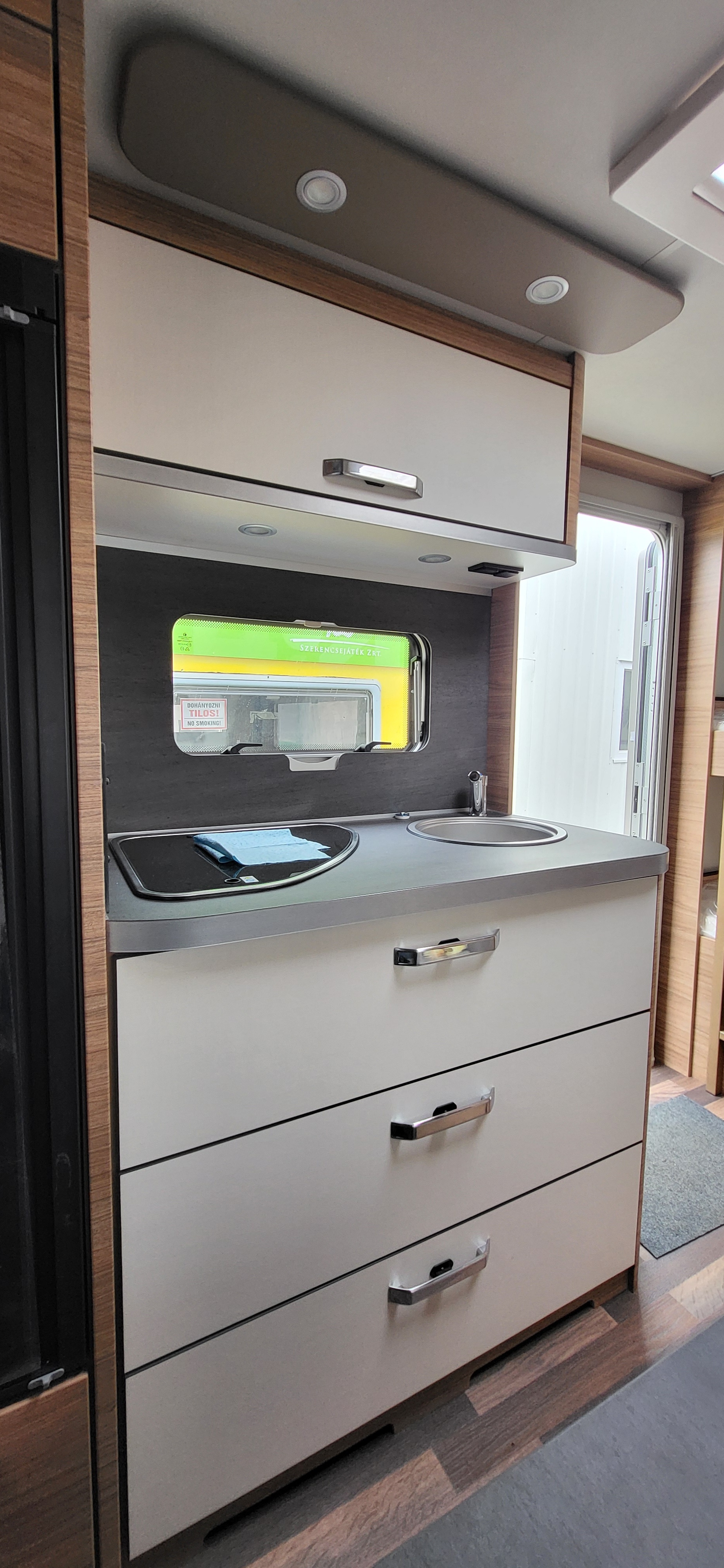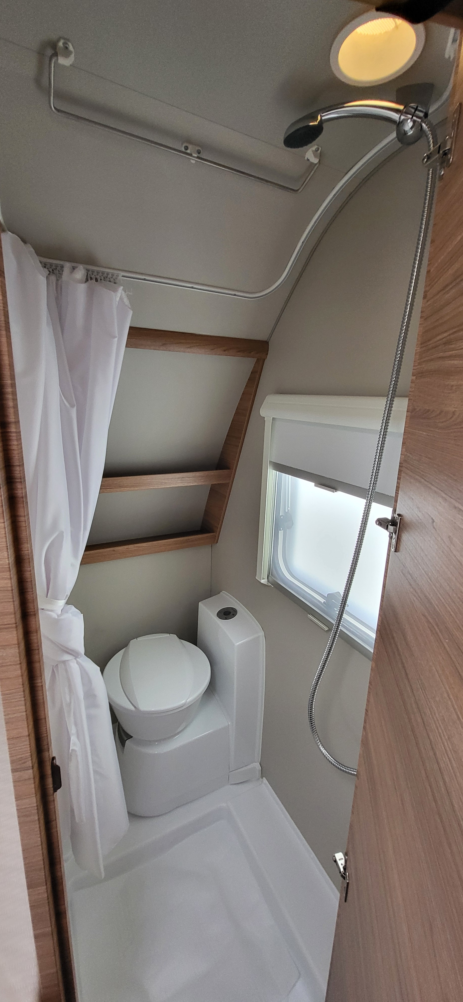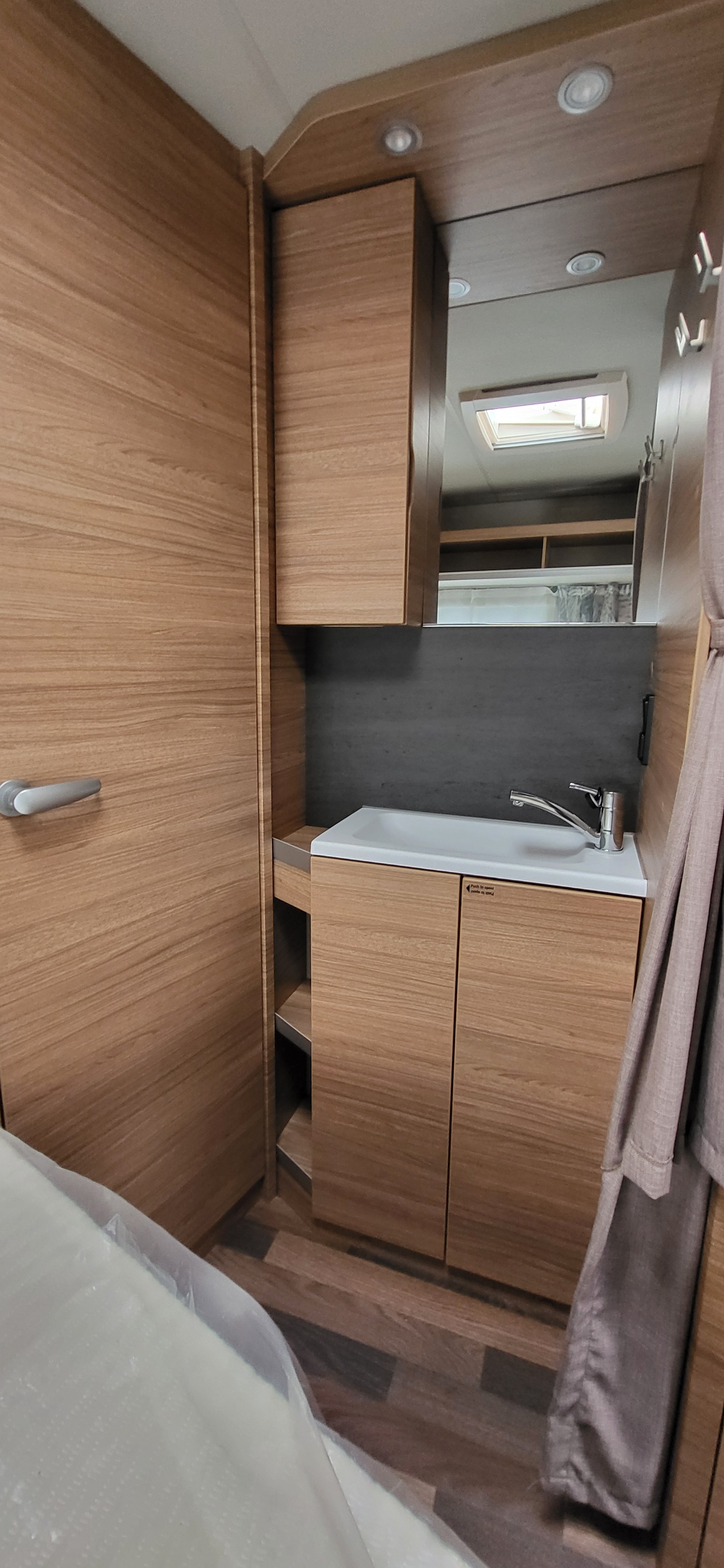 Mosogató,133L-es Thetford hűtő, tűzhely, 12V-os körfűtés, beépített mosdó, zuhanyfülke beépített bio Wc-vel, kombirolók, szúnyoghálós ajtó, térelválasztó függöny, hideg-meleg vízrendszer, beépített víztartály, 45 literes beépített tisztavíztartály, 25l-es mobil szennyvíztartály, panoráma tetőablak