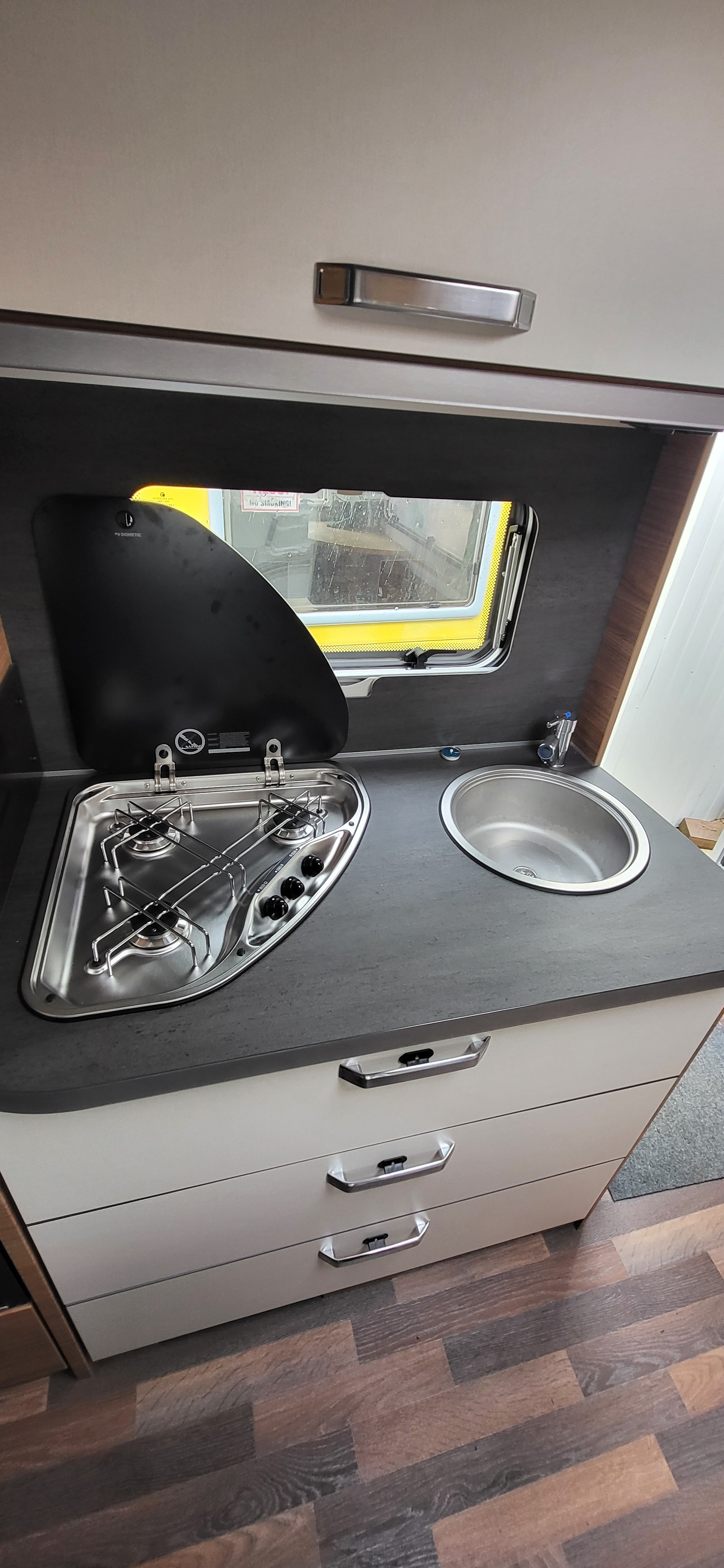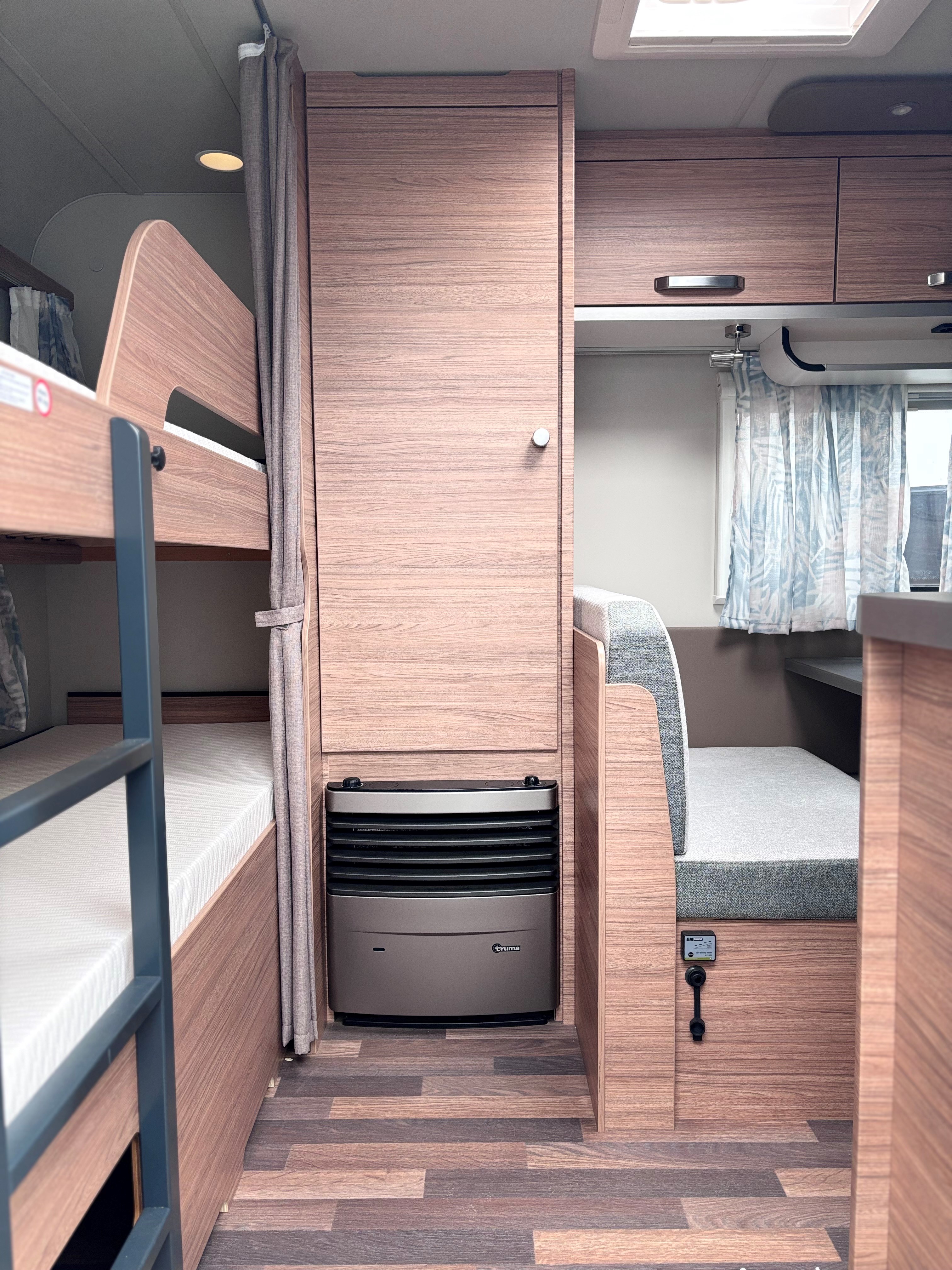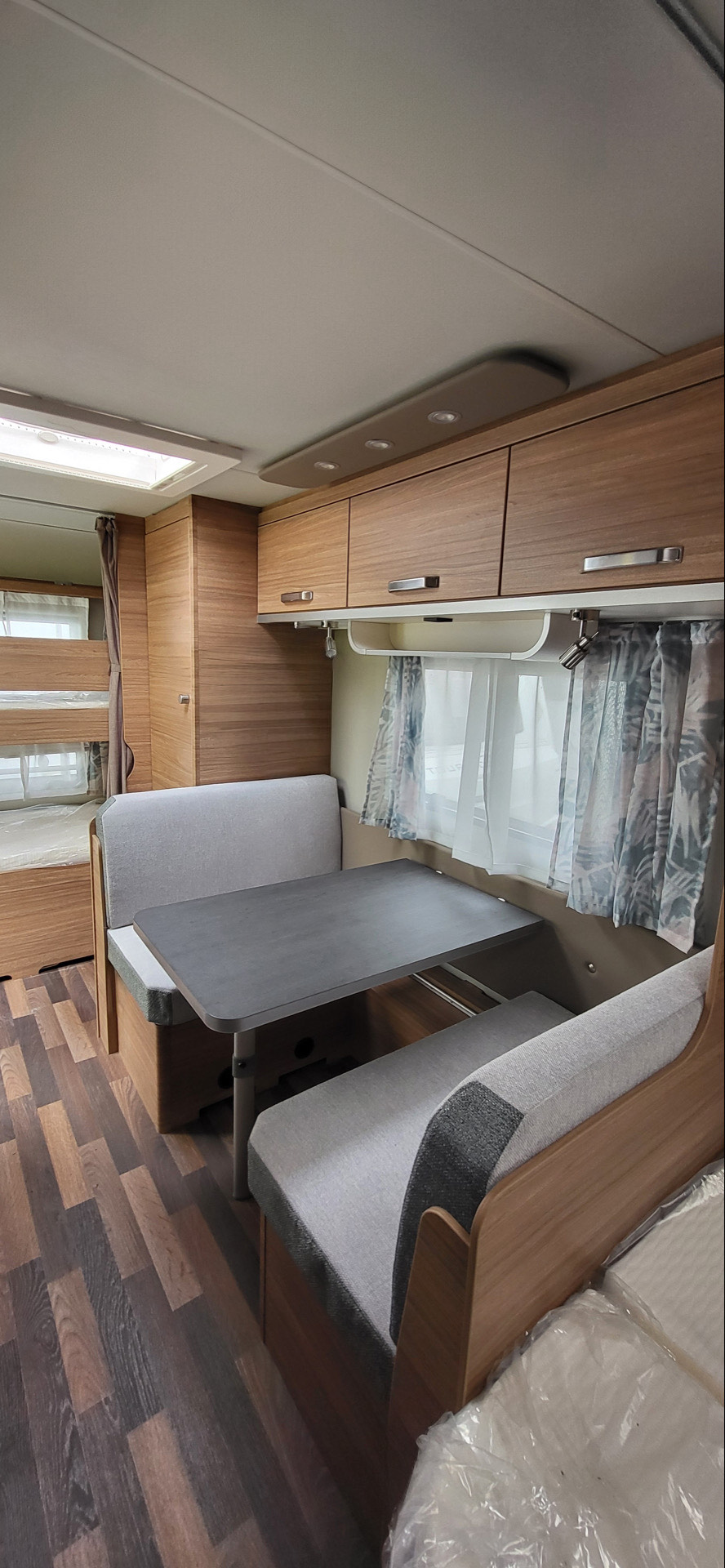 Mosogató,133L-es Thetford hűtő, tűzhely, 12V-os körfűtés, beépített mosdó, zuhanyfülke beépített bio Wc-vel, kombirolók, szúnyoghálós ajtó, térelválasztó függöny, hideg-meleg vízrendszer, beépített víztartály, 45 literes beépített tisztavíztartály, 25l-es mobil szennyvíztartály, panoráma tetőablak