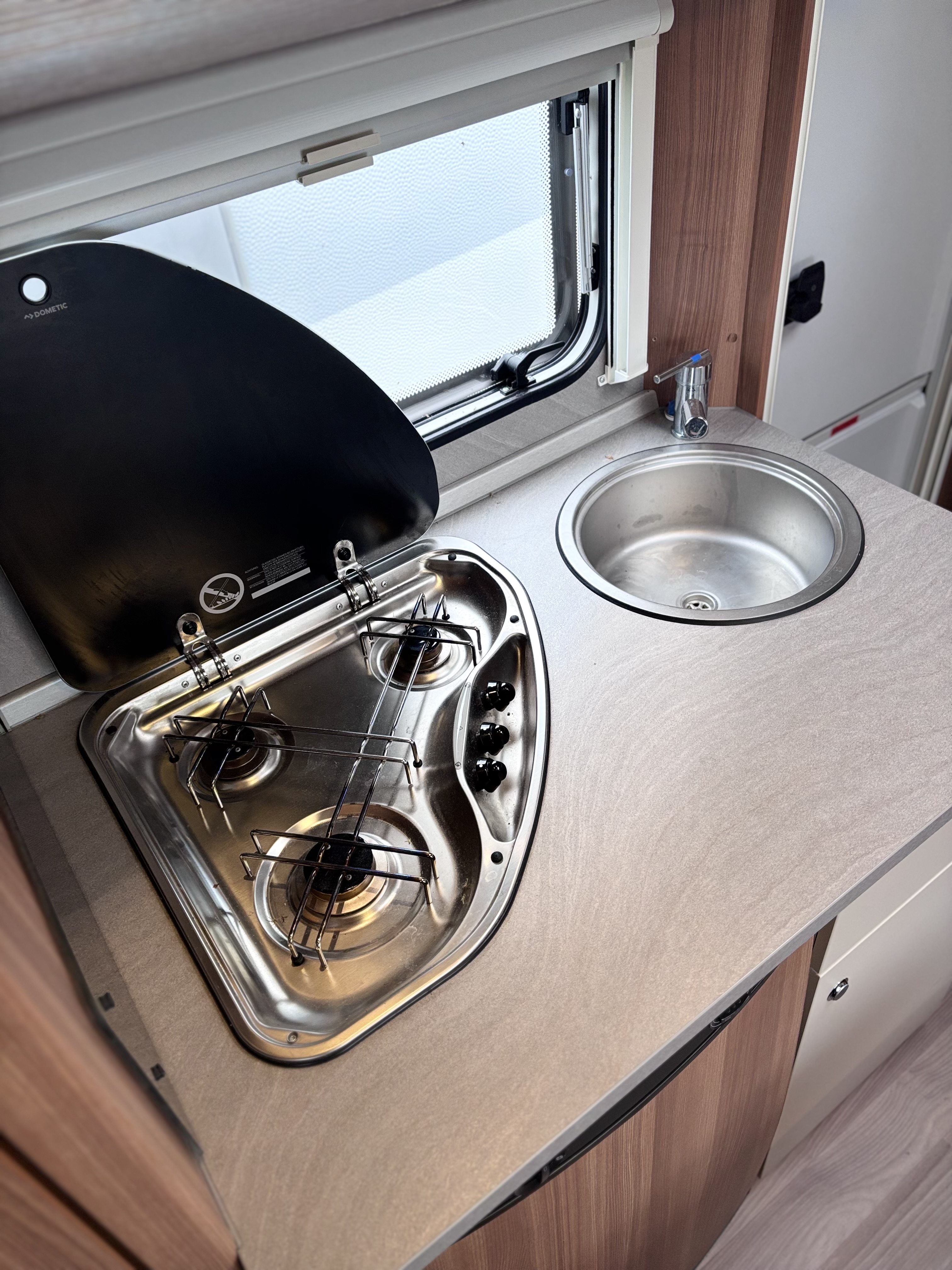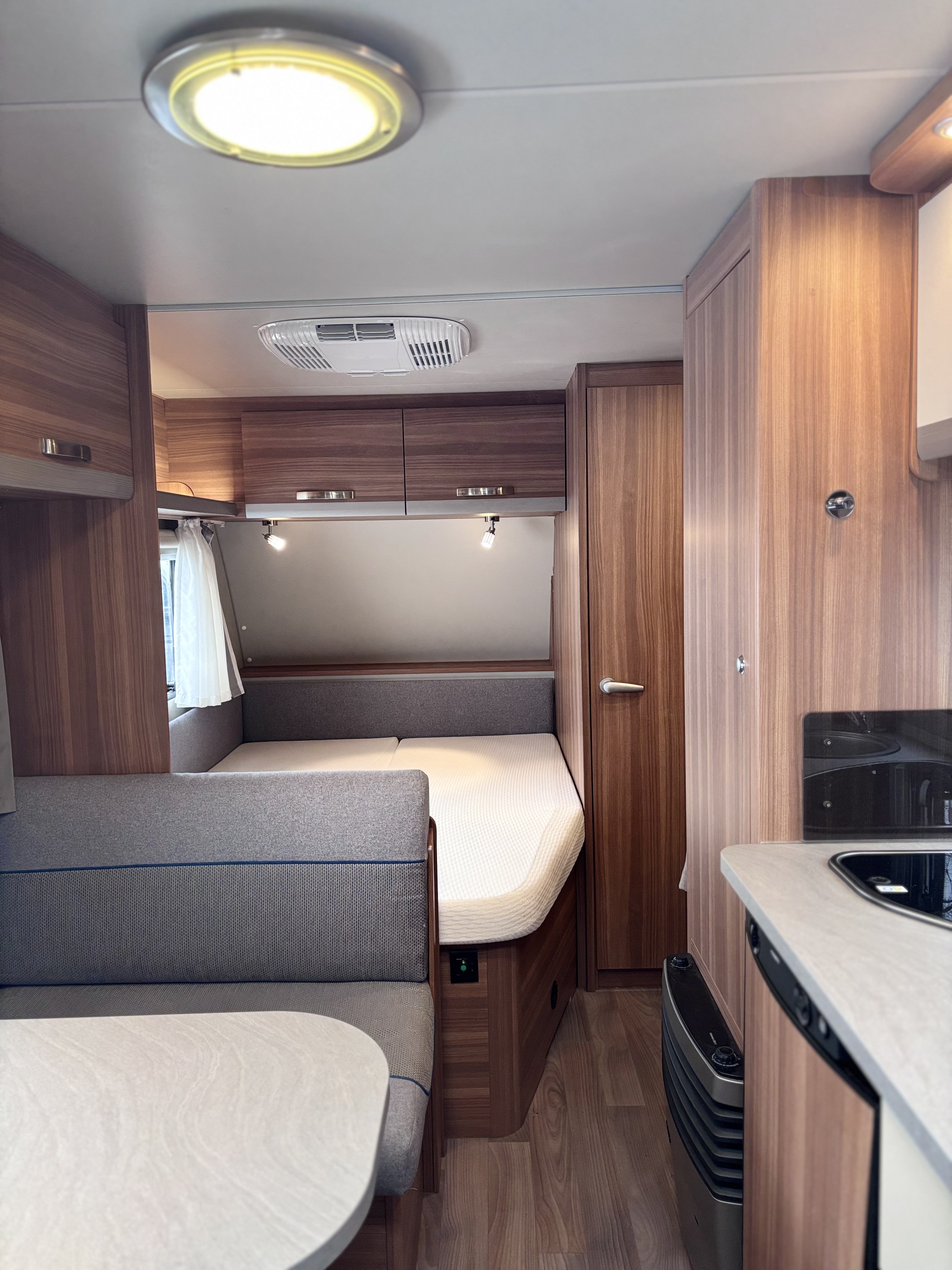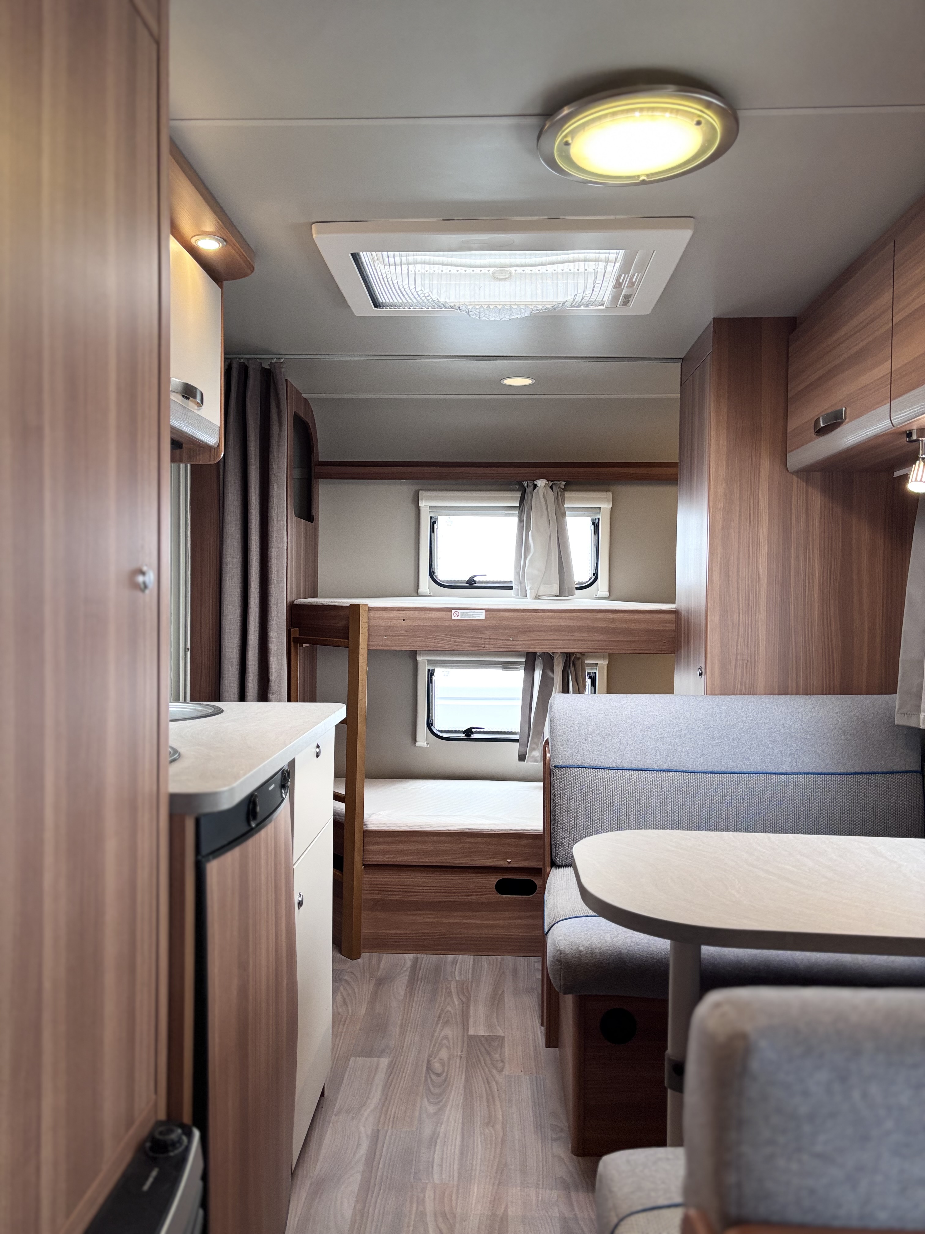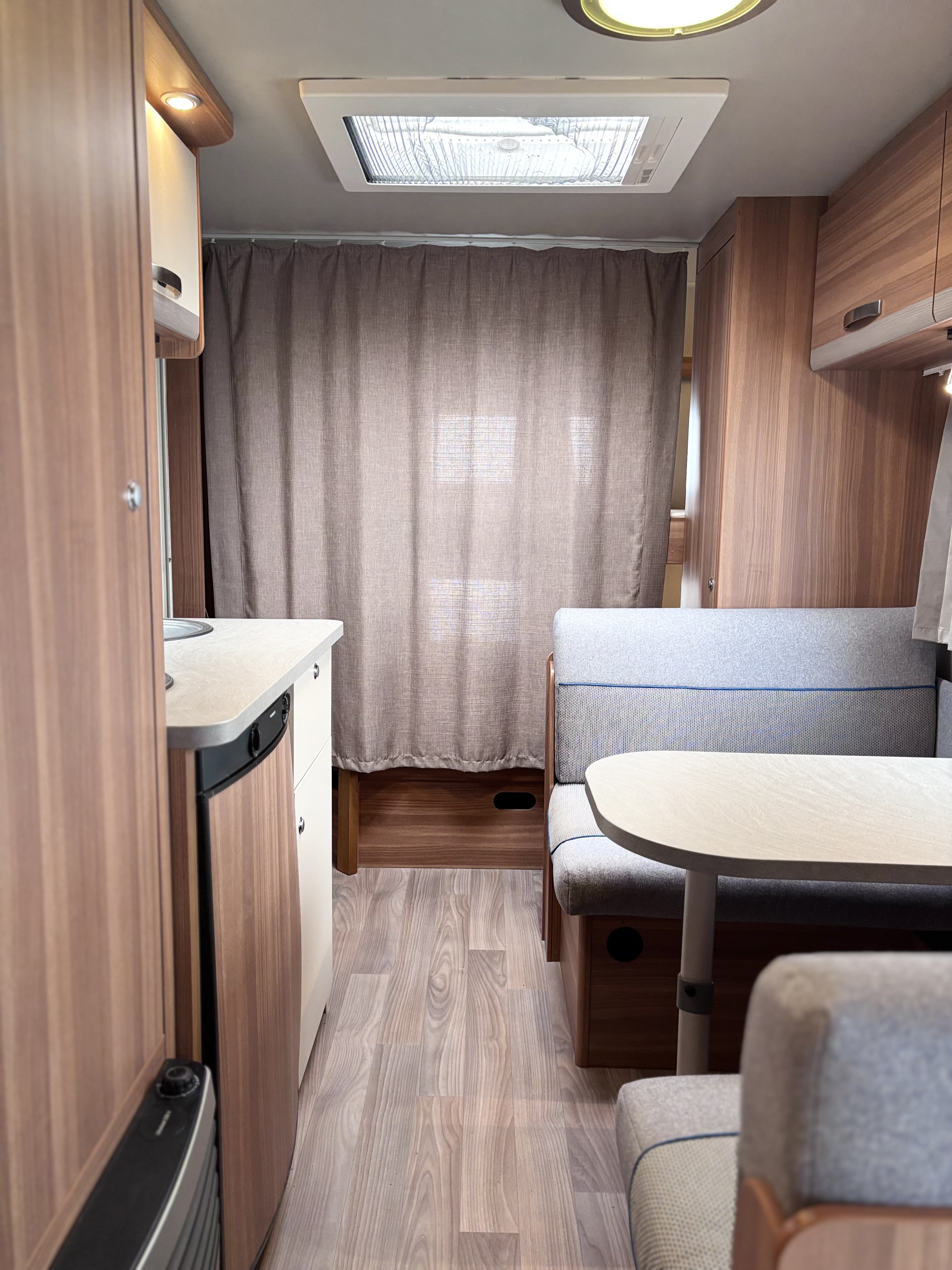 Mosogató, Dometic hűtő, 3 égőfejes tűzhely, Truma gázfűtés 12V-os körfűtéssel, mosdófülke beépített bio-Wc-vel és zuhanyzóval, kombirolók, szúnyoghálós ajtó, térelválasztó függöny, hideg-meleg vízrendszer, beépített víztartály, 25l-es mobil szennyvíztartály, olvasólámpa, panoráma tetőablak, Webasto tetőklíma, Truma Ultraheat, Truma Therme 5 literes elektromos bojlerrel