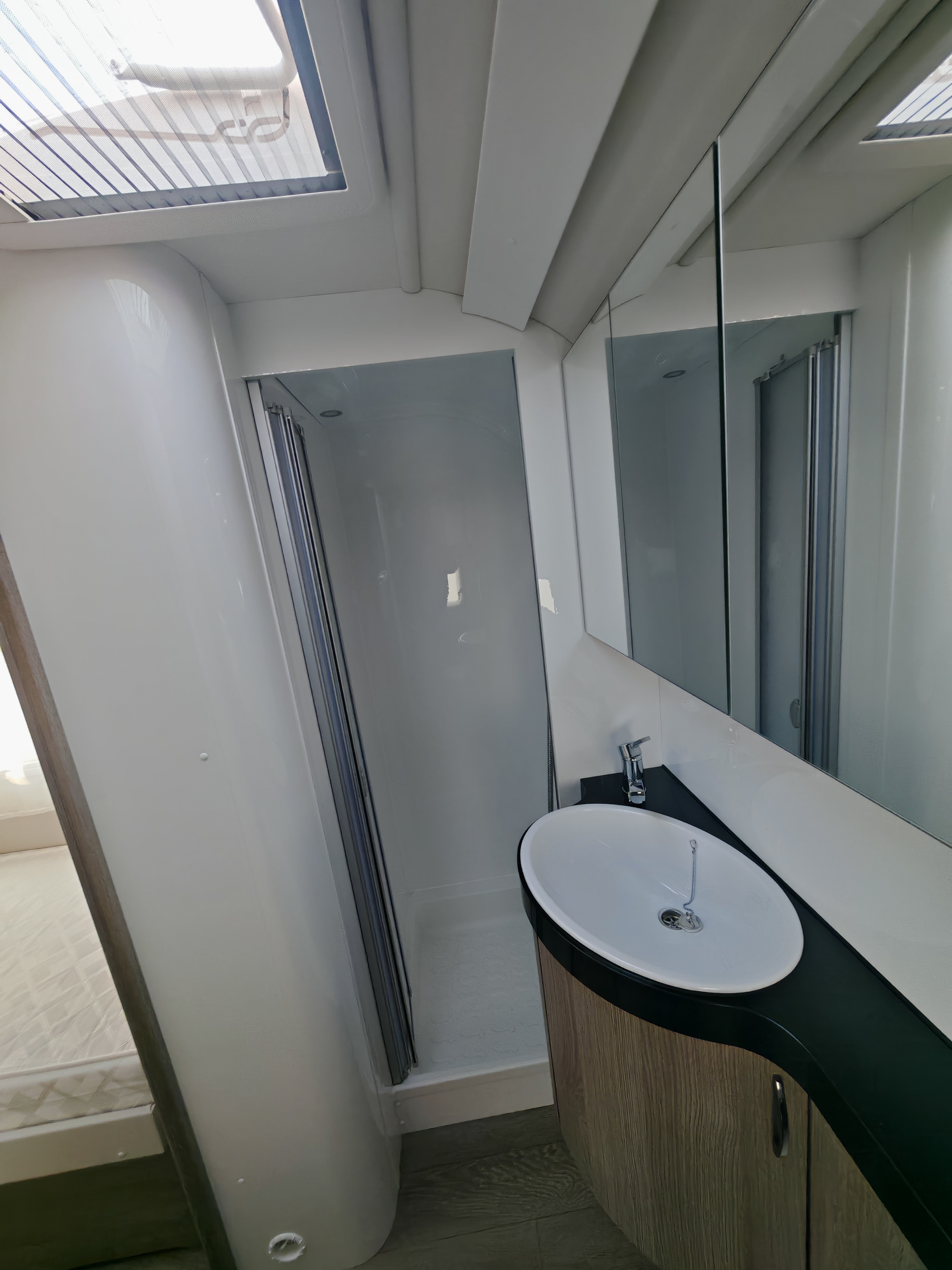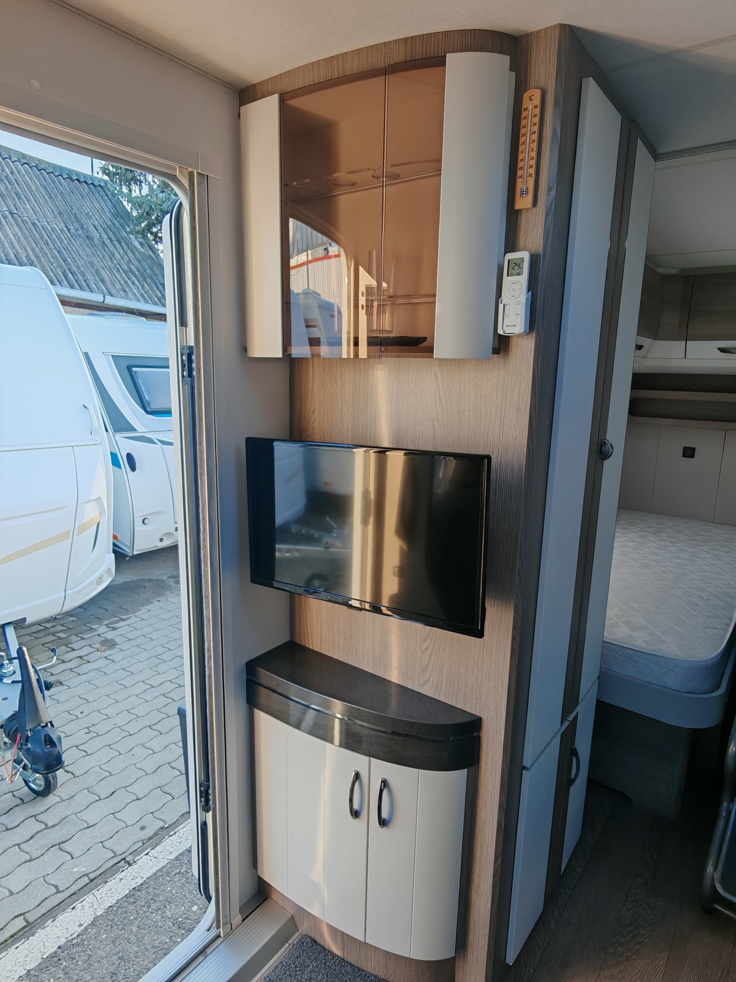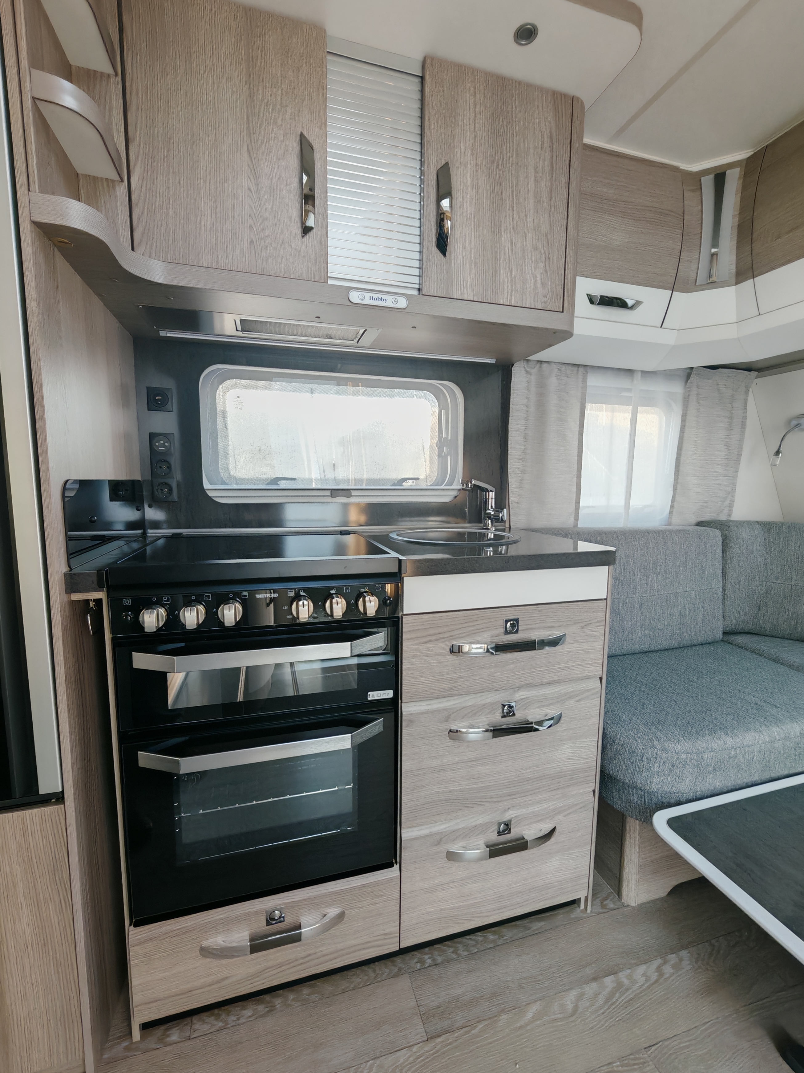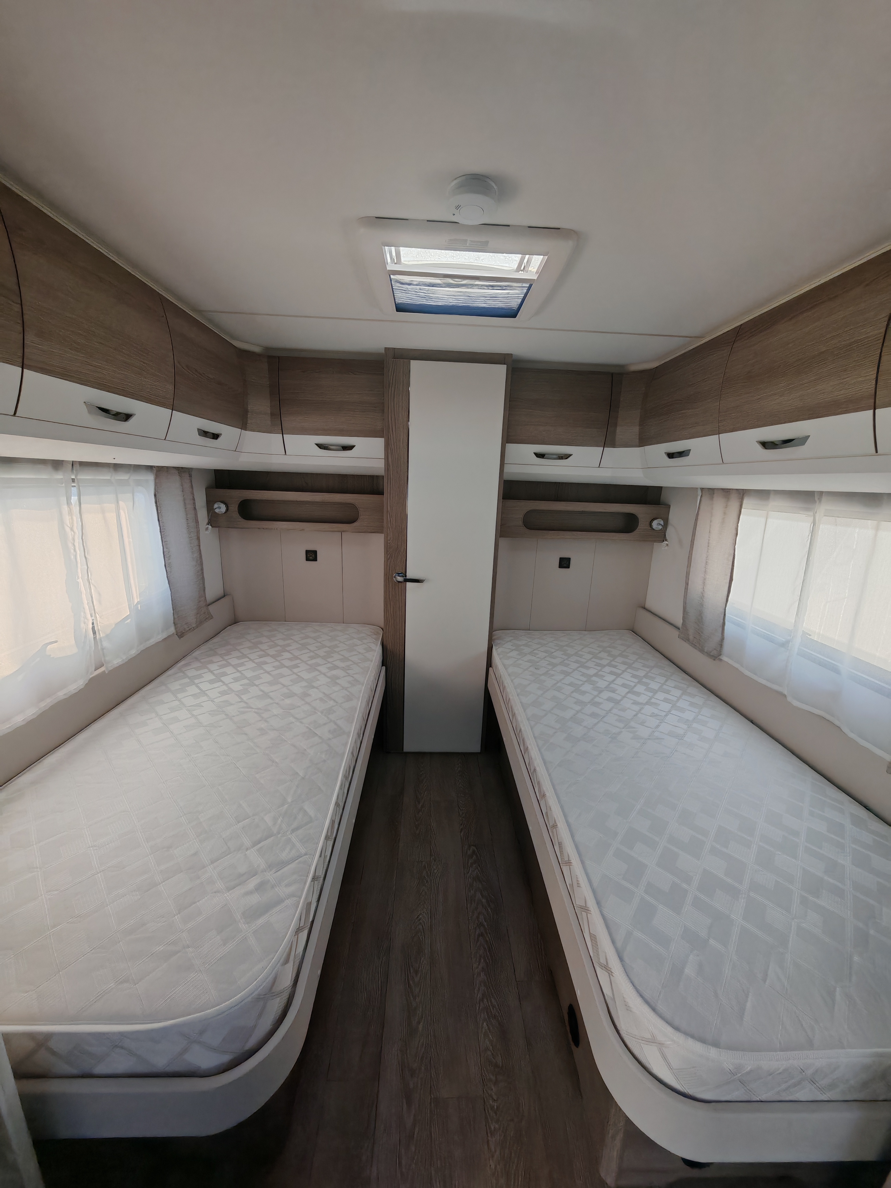 Fekvőhelyek száma: 4 fő, mosogató, toronyhűtő, 3 égőfejes tűzhely, Thetford sütő, mosdófülke beépített bio-Wc-vel és zuhanytálcával, hideg-meleg vízrendszer, beépített víztartály, szennyvíztartály, panoráma tetőablak, kombirolók, Truma INet központ, gázriasztó, térelválasztó, gardróbszekrény, olvasólámpa, Sinclair tetőklíma, TV, padlófűtés, Truma Combi gáz-elektromos kazán