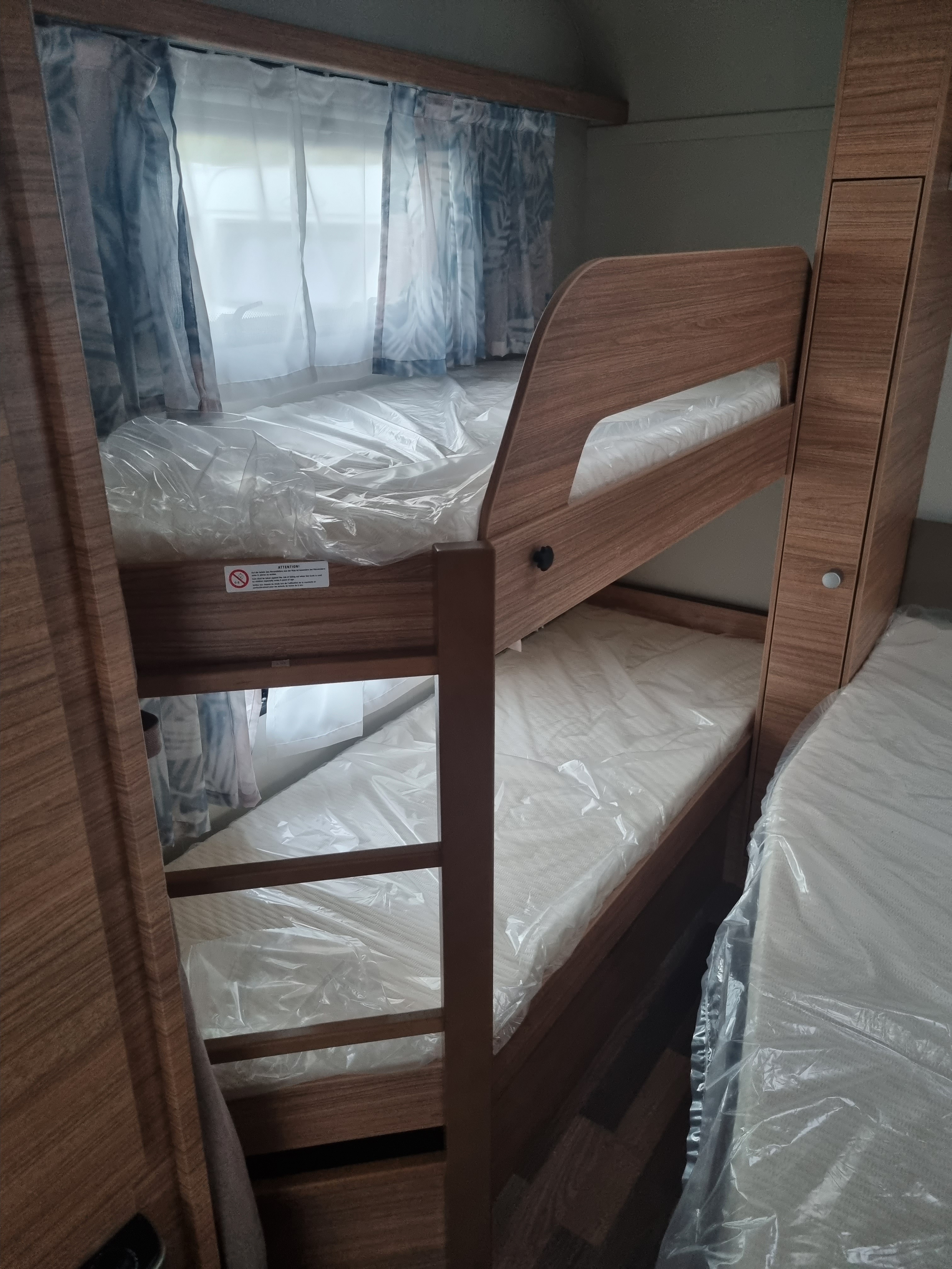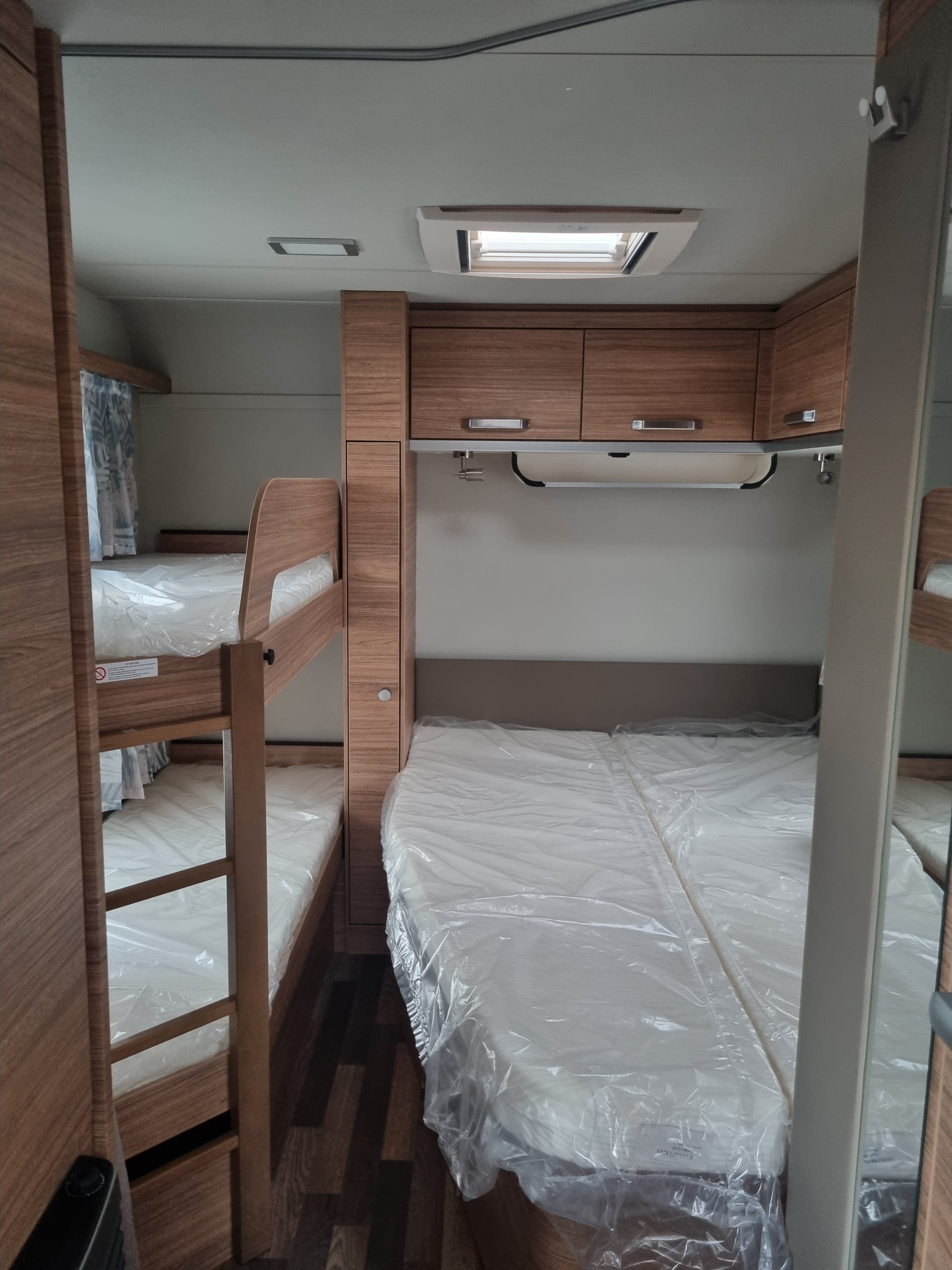 Mosogató, hűtő, tűzhely, 12V-os körfűtés, toronyhűtő, zuhanyfülke zuhanytálcával, beépített mosdóval és bio-Wc-vel, kombiroló, hideg-meleg vízrendszer, 45l-es beépített víztartály, 25l-es mobil szennyvíztartály, panoráma tetőablak, stabilizátoros vonófej, szúnyoghálós ajtó