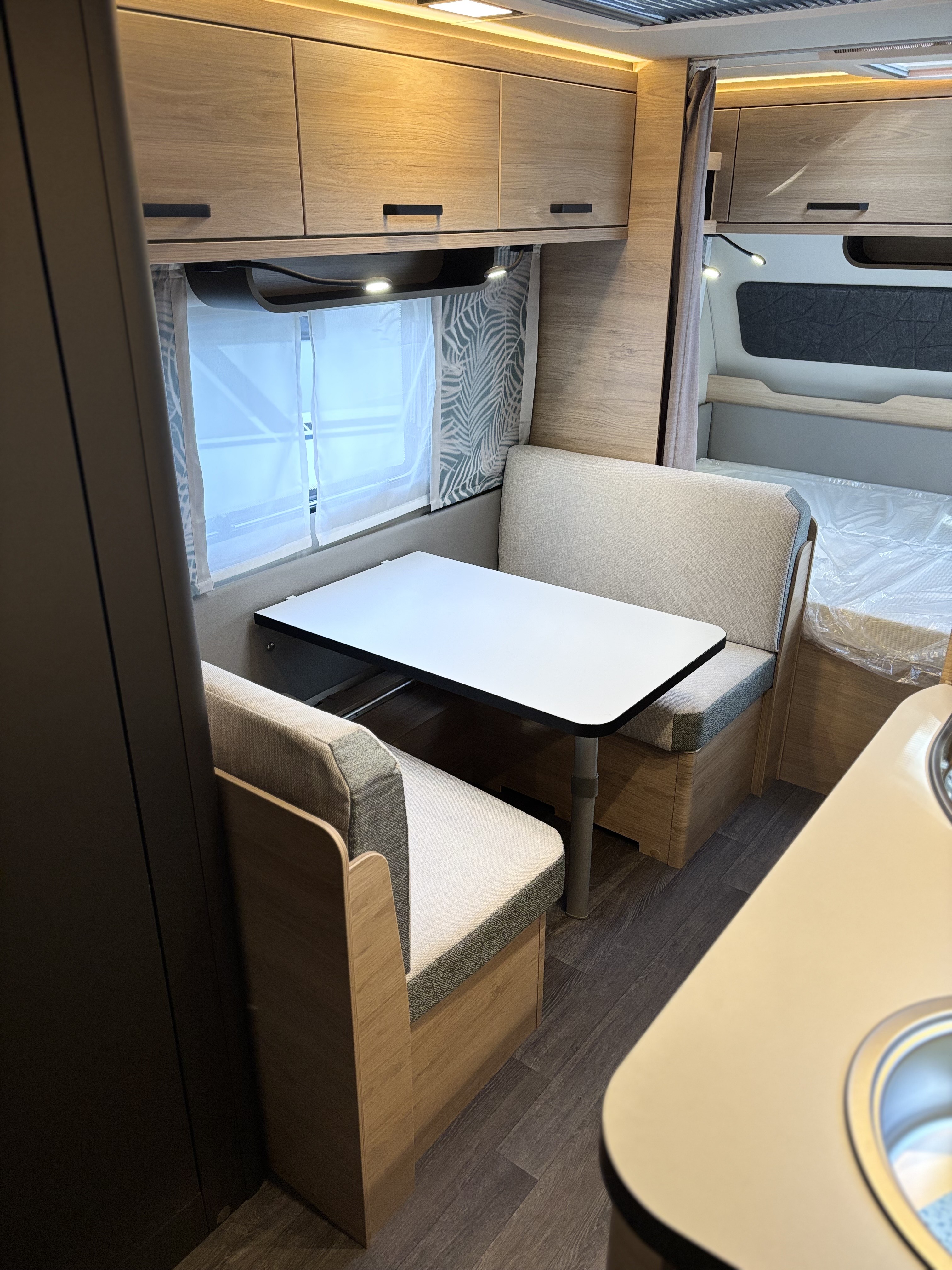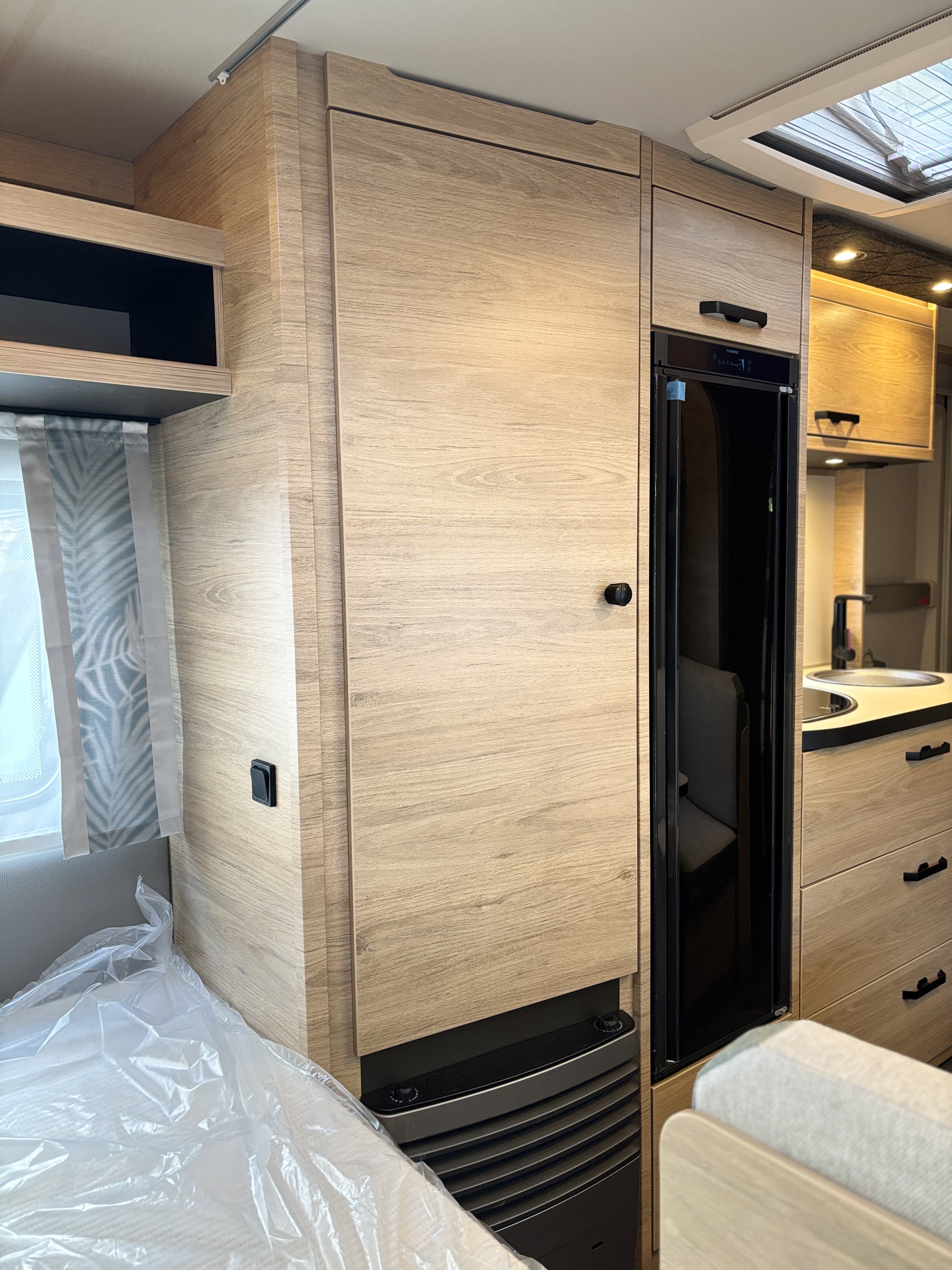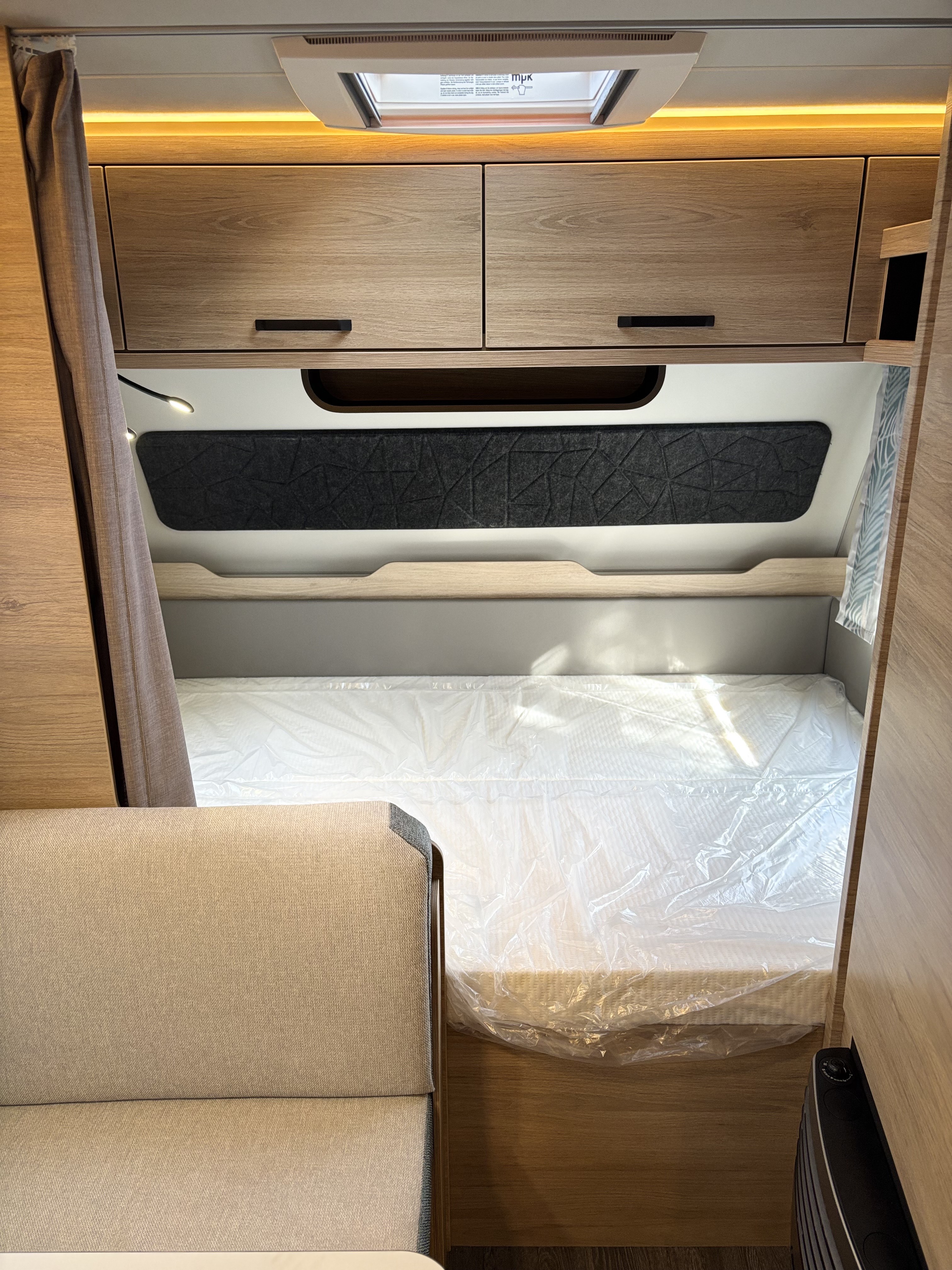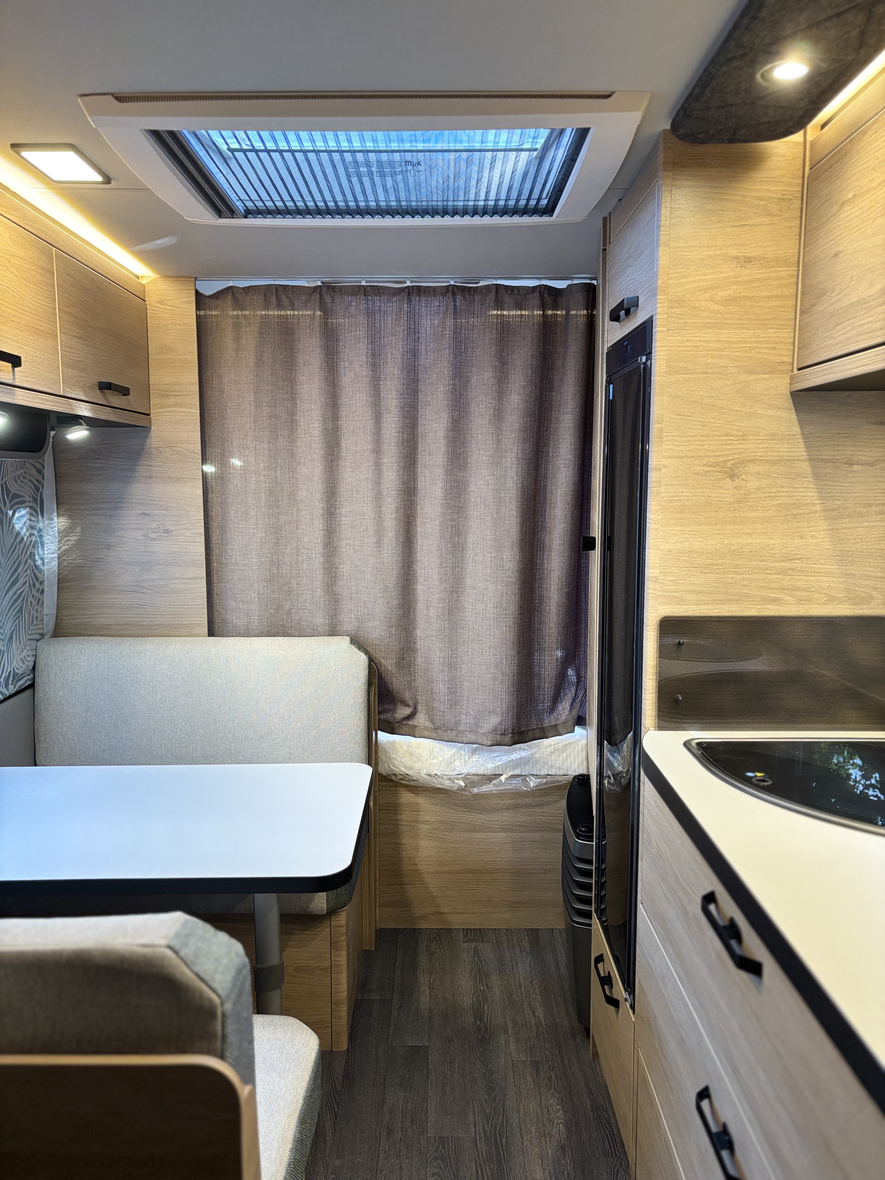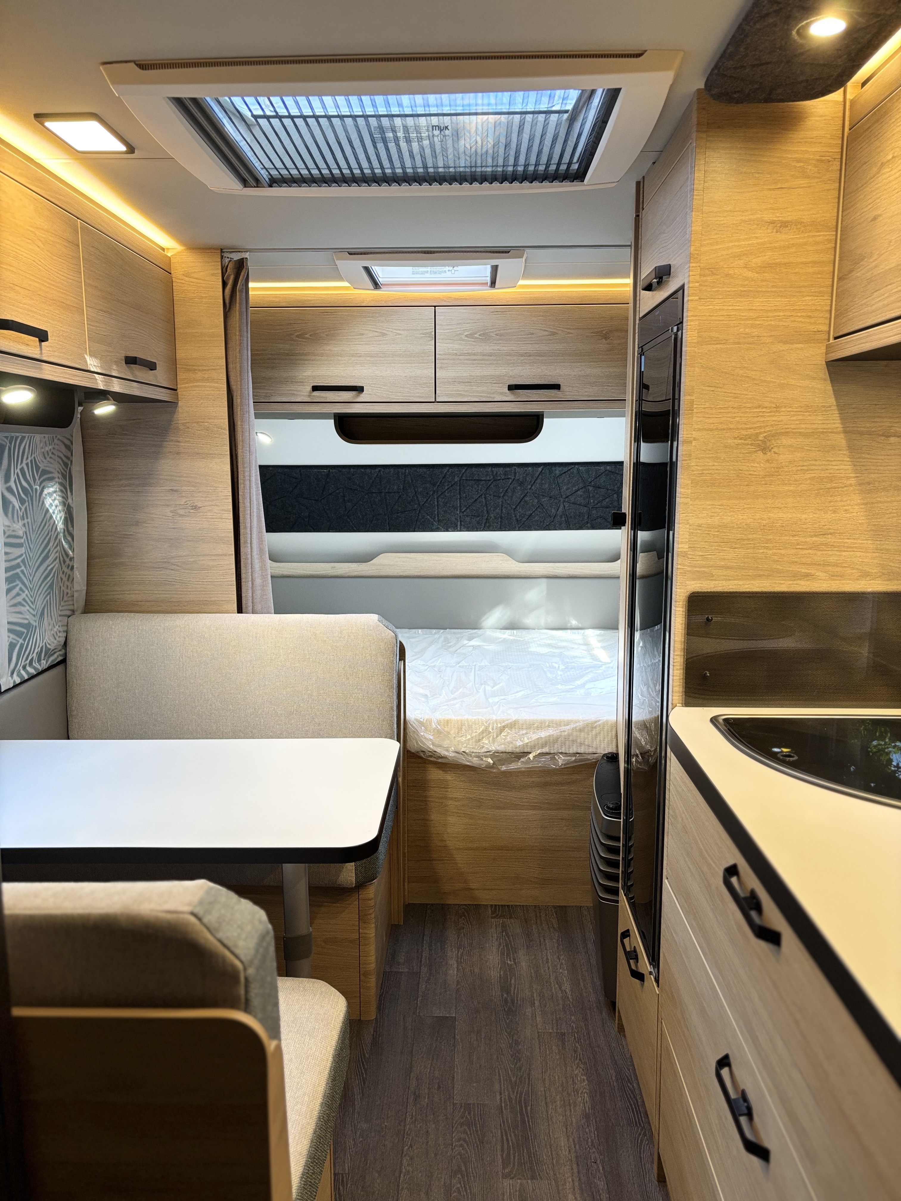 Mosogató, 133 L-es Thetford hűtő, 3 égőfejes tűzhely, 12V-os körfűtés, beépített mosdófülke zuhanytálcával és beépített bio-Wc-vel, kombirolók, hideg-melegvíz rendszer, 45 l-es beépített víztartály, 25l-es mobil szennyvíztartály, panoráma tetőablak, EvoPore HRC matrac, térelválasztó függöny, Truma S 3004 gázfűtés, olvasólámpa
