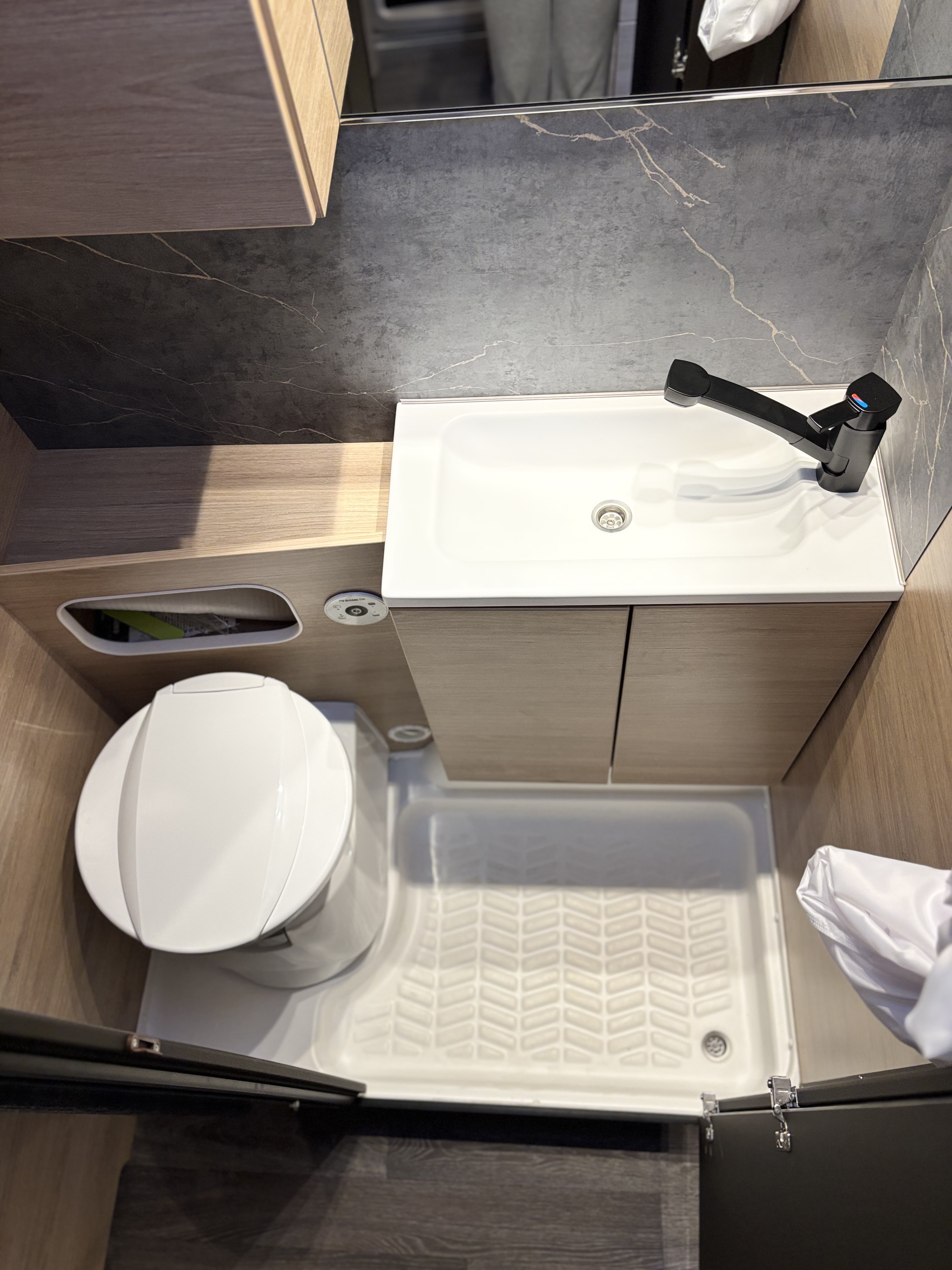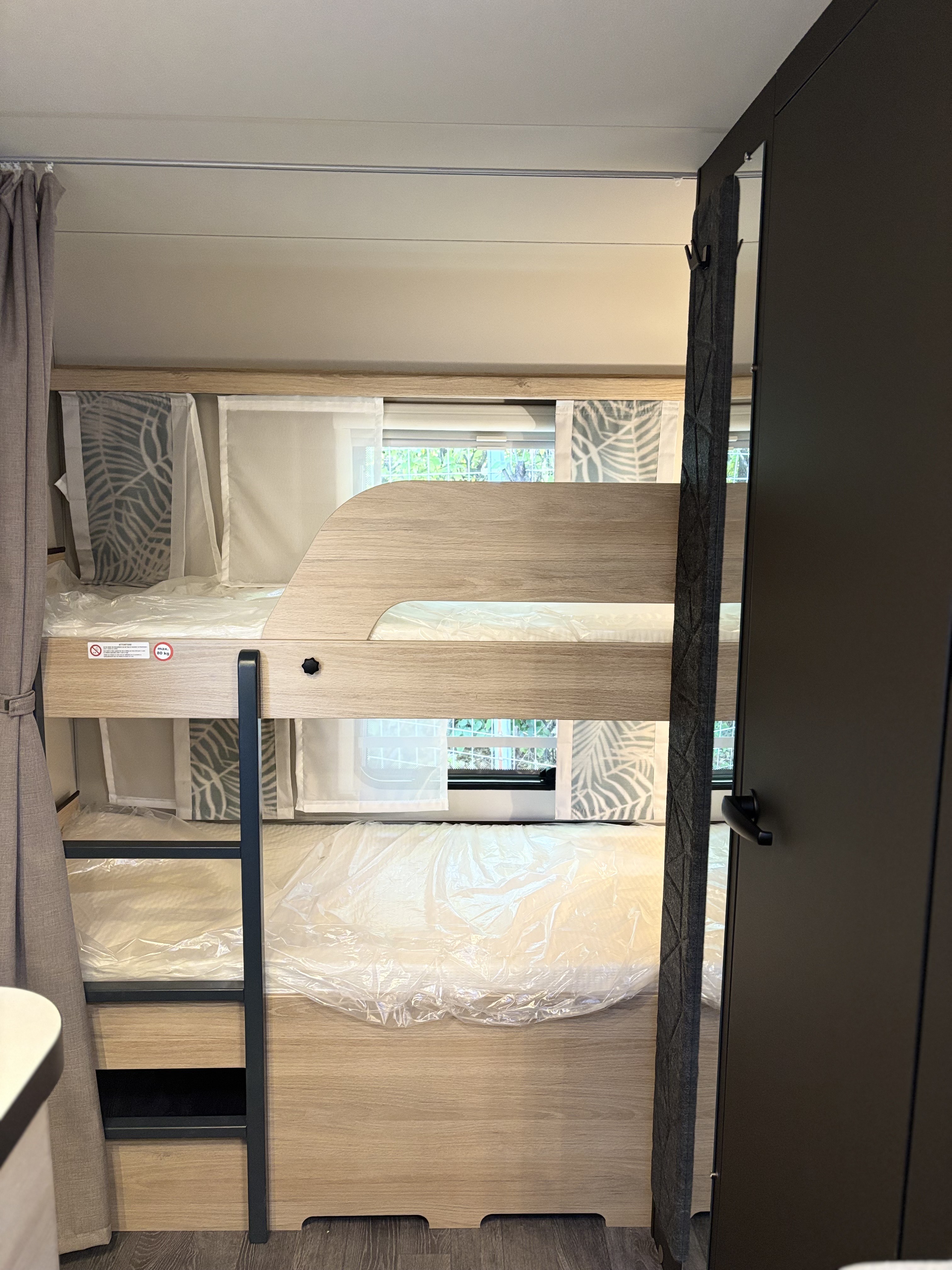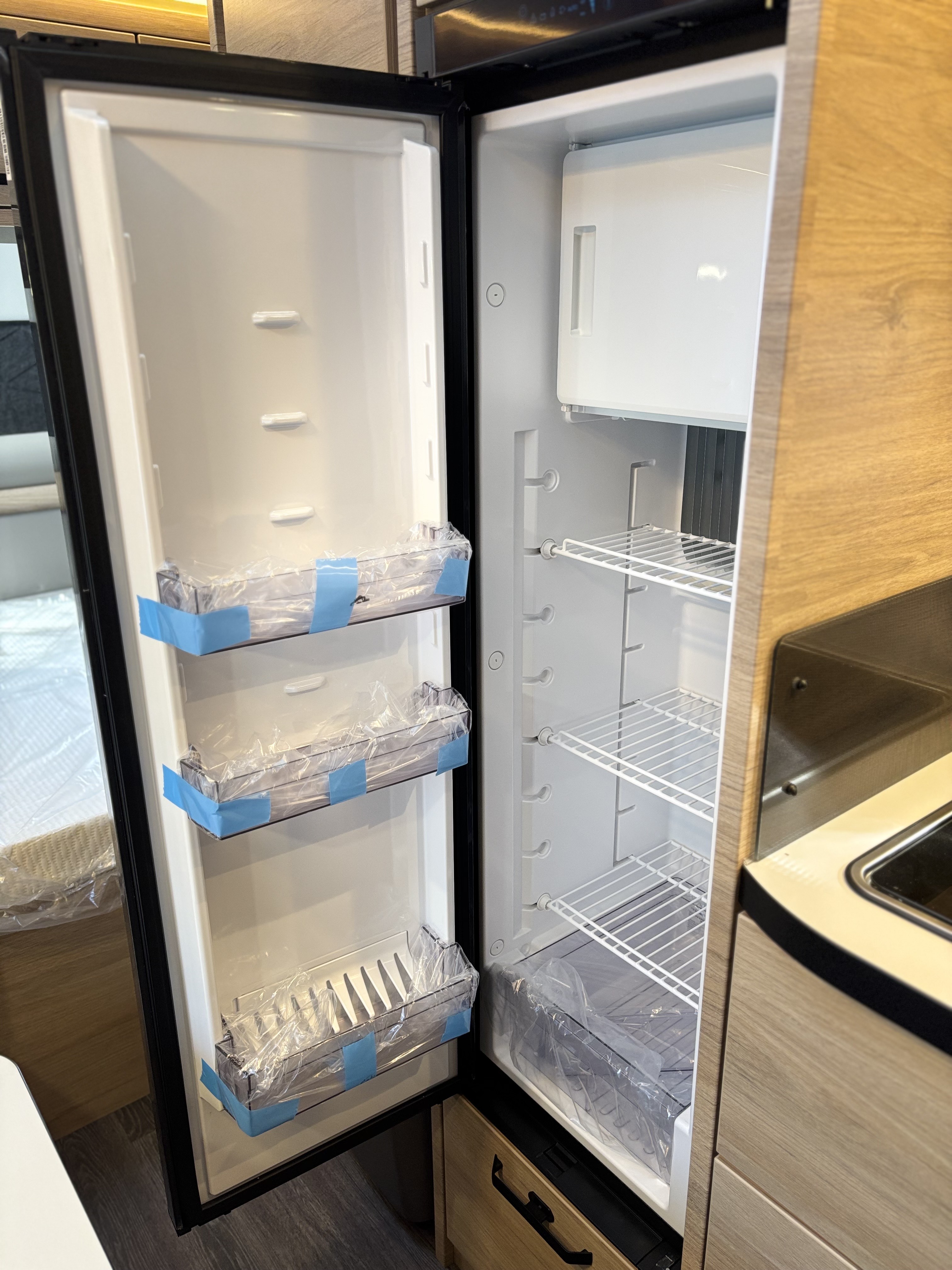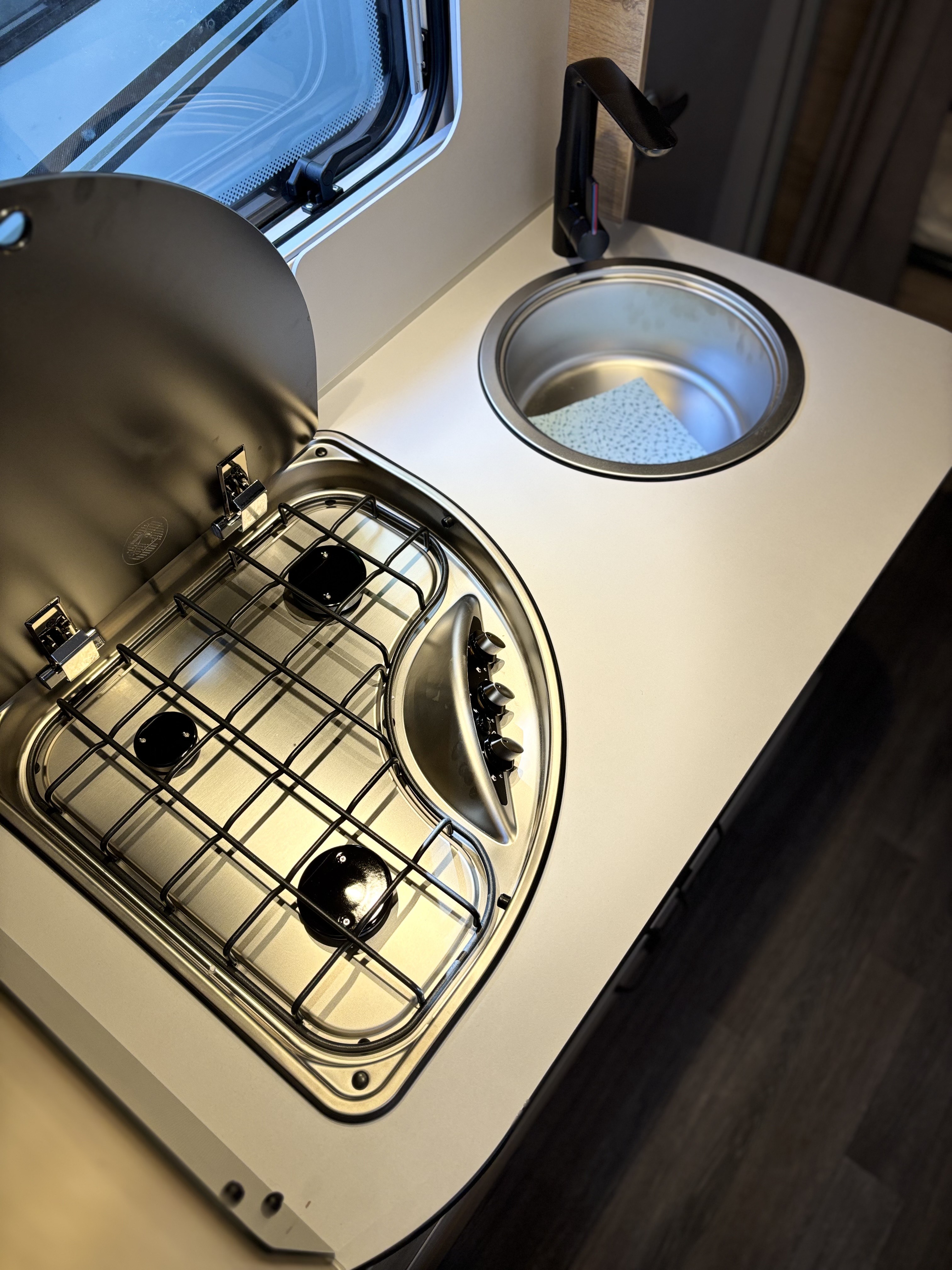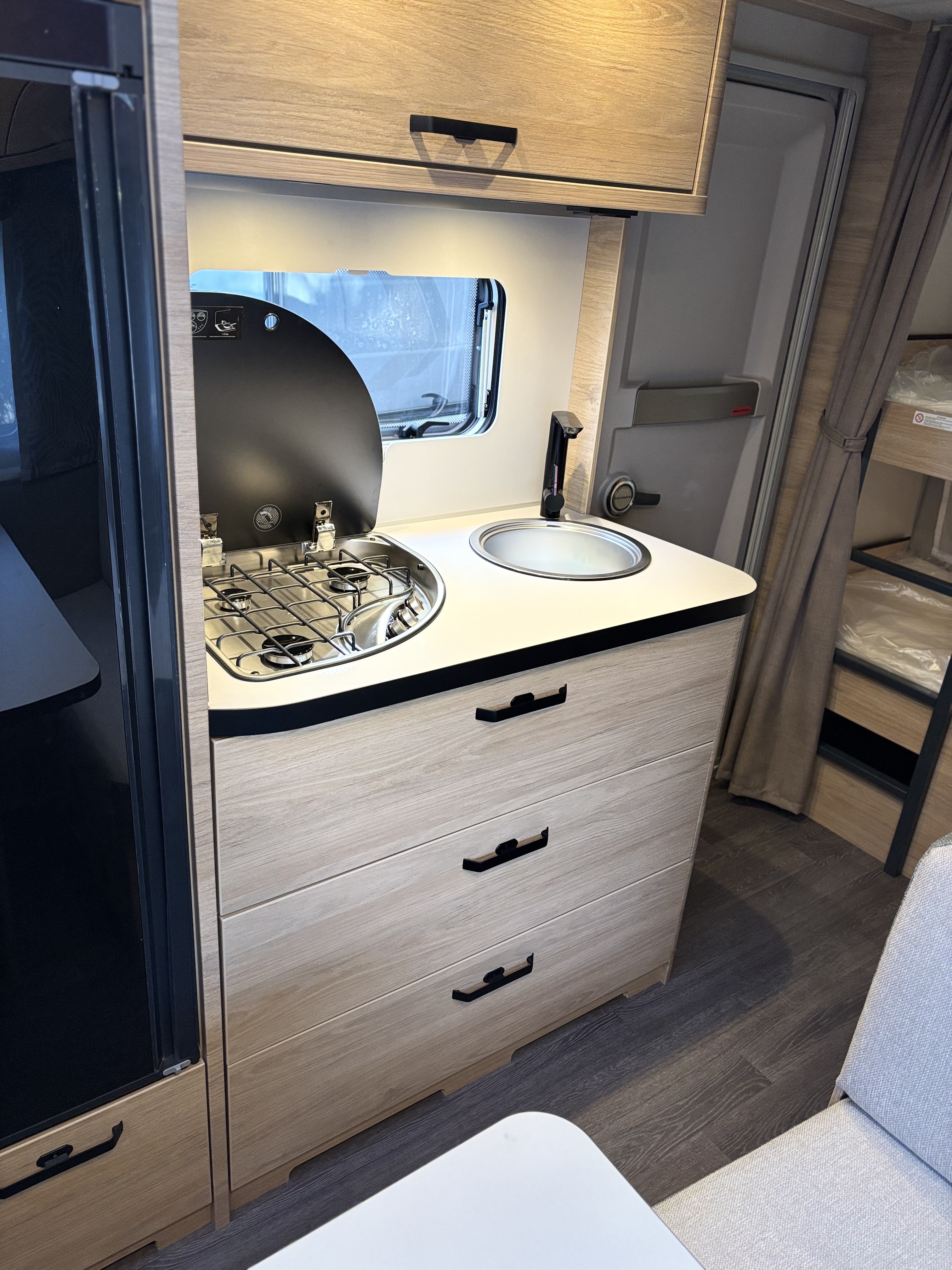 Mosogató, 133 L-es Thetford hűtő, 3 égőfejes tűzhely, 12V-os körfűtés, beépített mosdófülke zuhanytálcával és beépített bio-Wc-vel, kombirolók, hideg-melegvíz rendszer, 45 l-es beépített víztartály, 25l-es mobil szennyvíztartály, panoráma tetőablak, EvoPore HRC matrac, térelválasztó függöny, Truma S 3004 gázfűtés, olvasólámpa