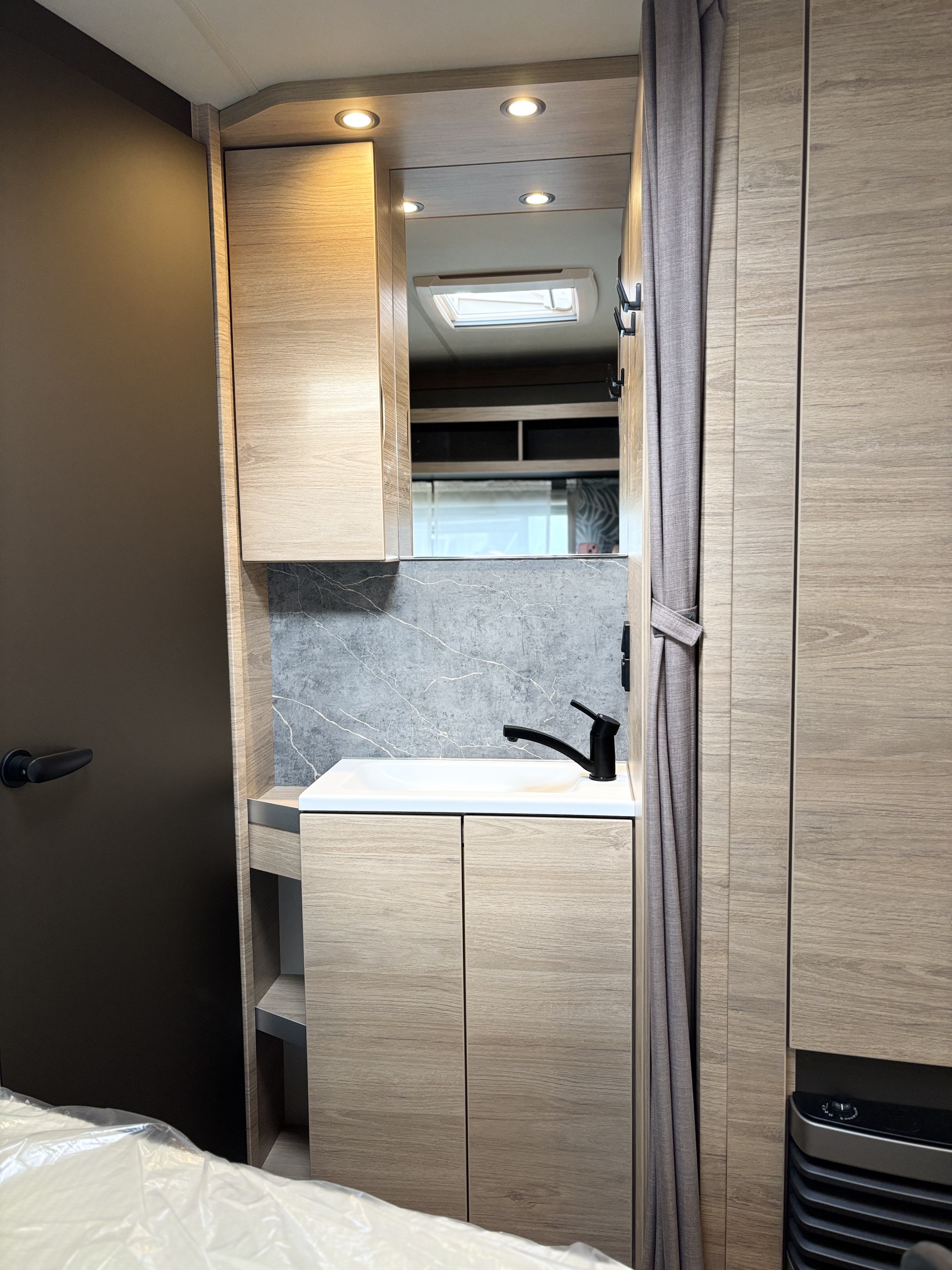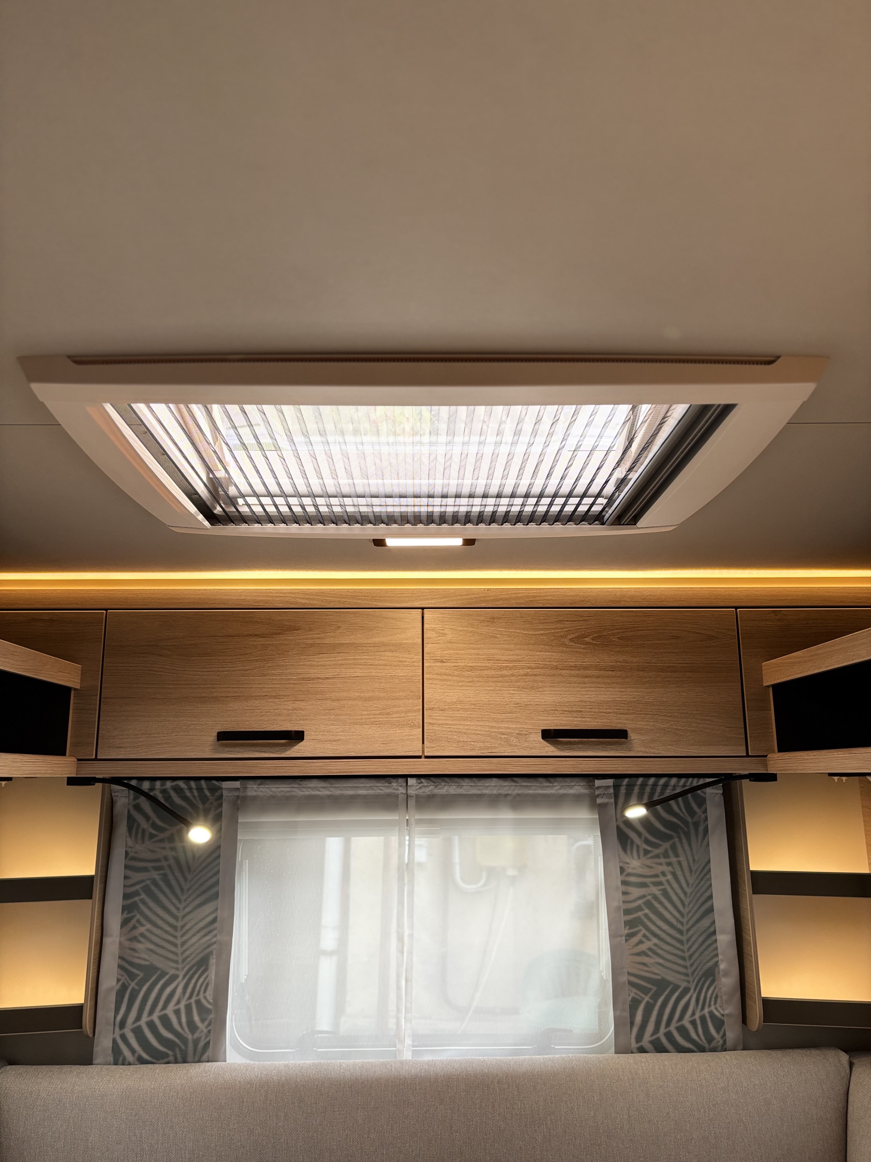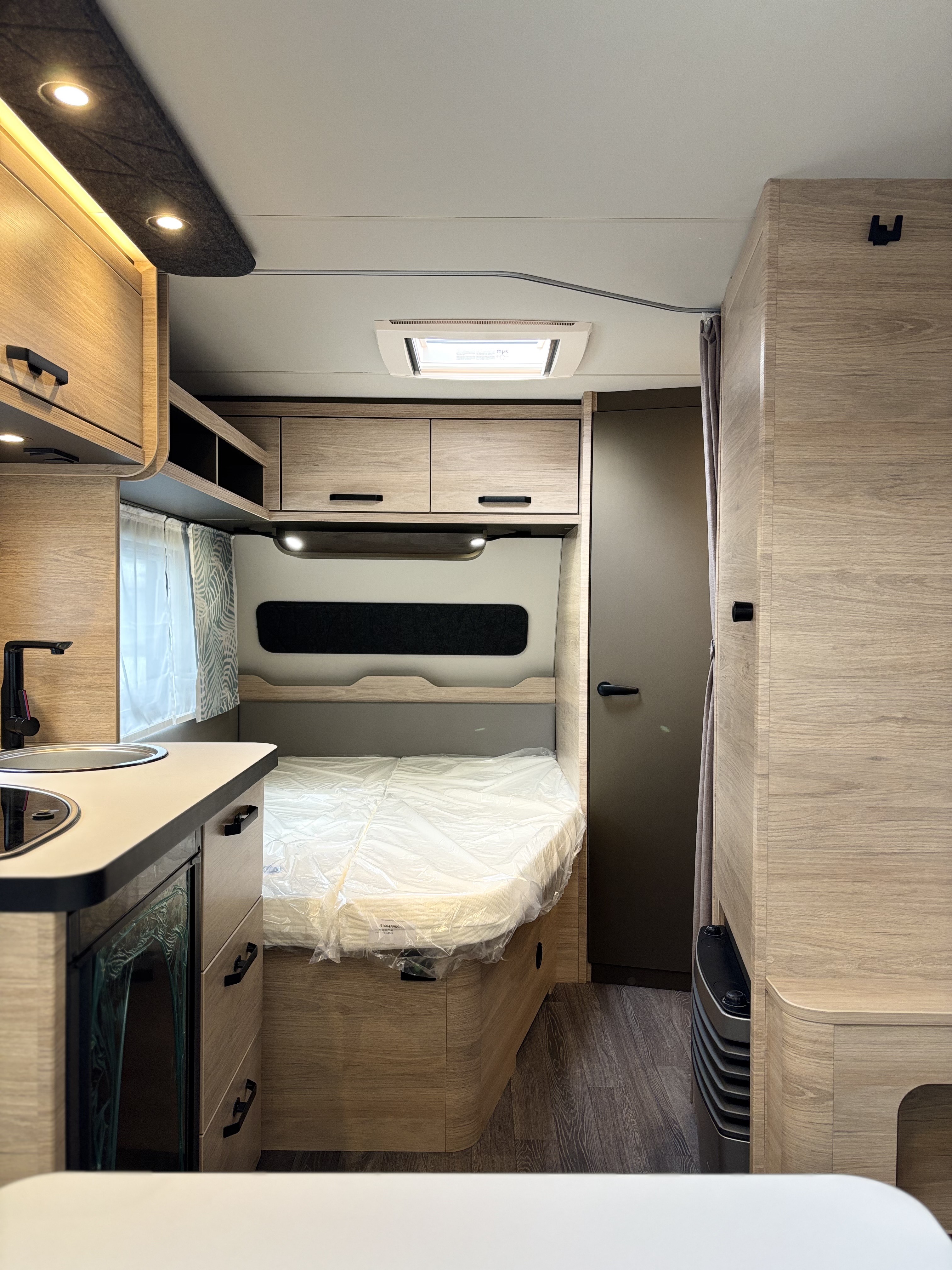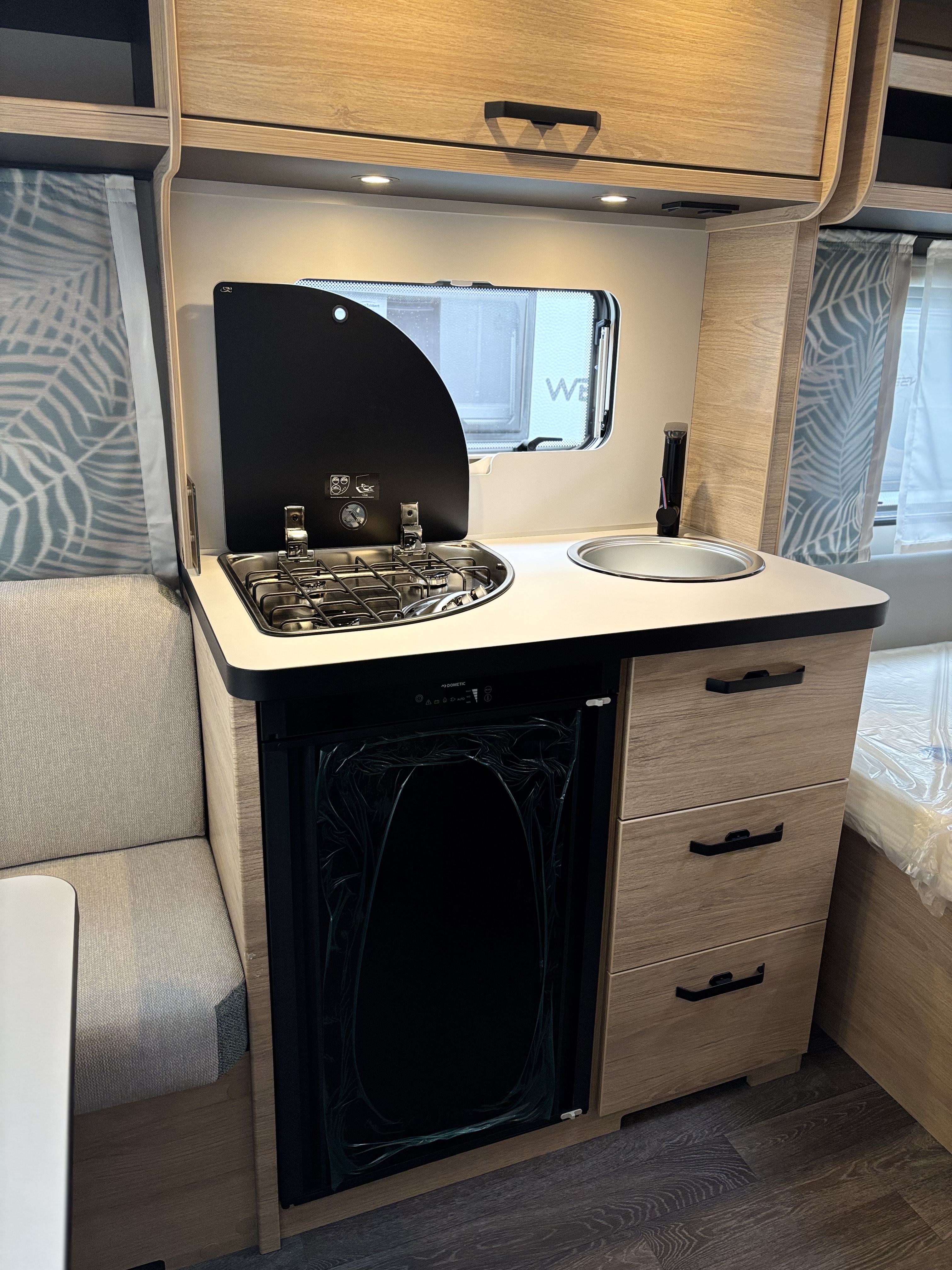 Mosogató, Dometic 98 L-es hűtő, 3 égőfejes tűzhely, mosdófülke zuhanytálcával és beépített bio-Wc-vel, kombirolók, hideg-melegvíz rendszer, 45l-es beépített víztartály, 25l-es mobil szennyvíztartály, 40x40 cm-es panoráma tetőablak, EvoPore HRC matrac, Forest kárpitozás, olvasólámpa, gardróbszekrény, Truma gázfűtés S 3004,