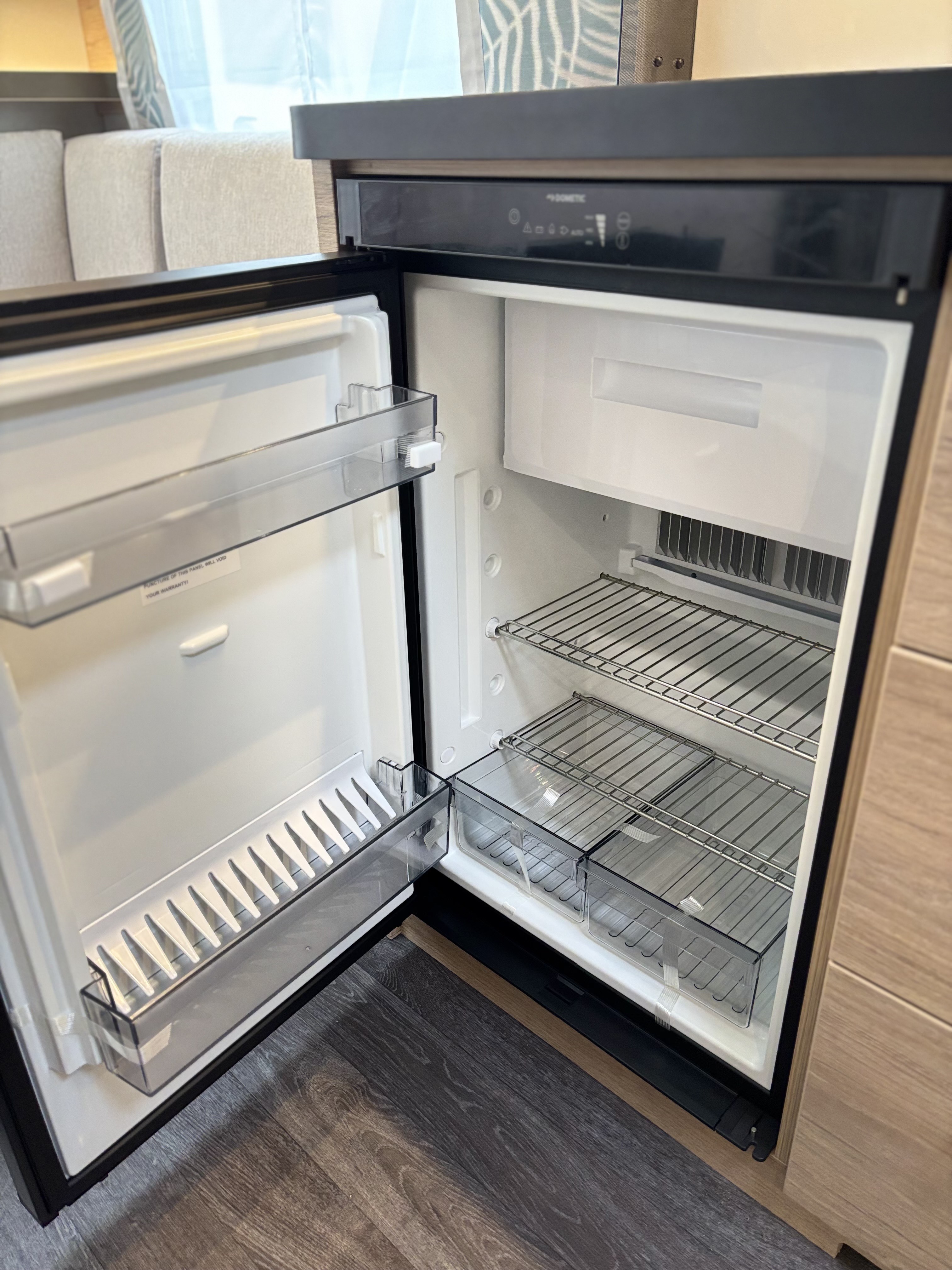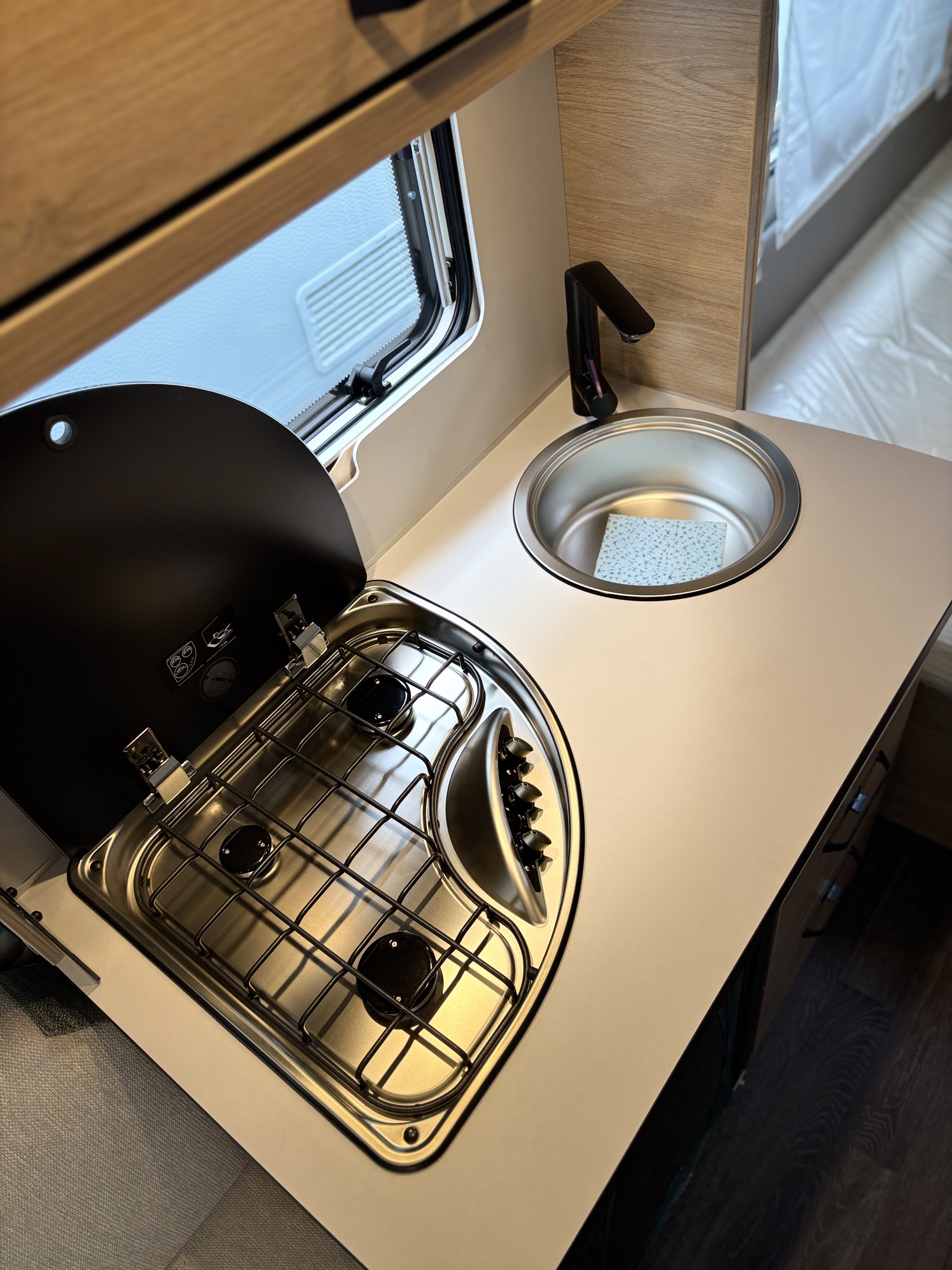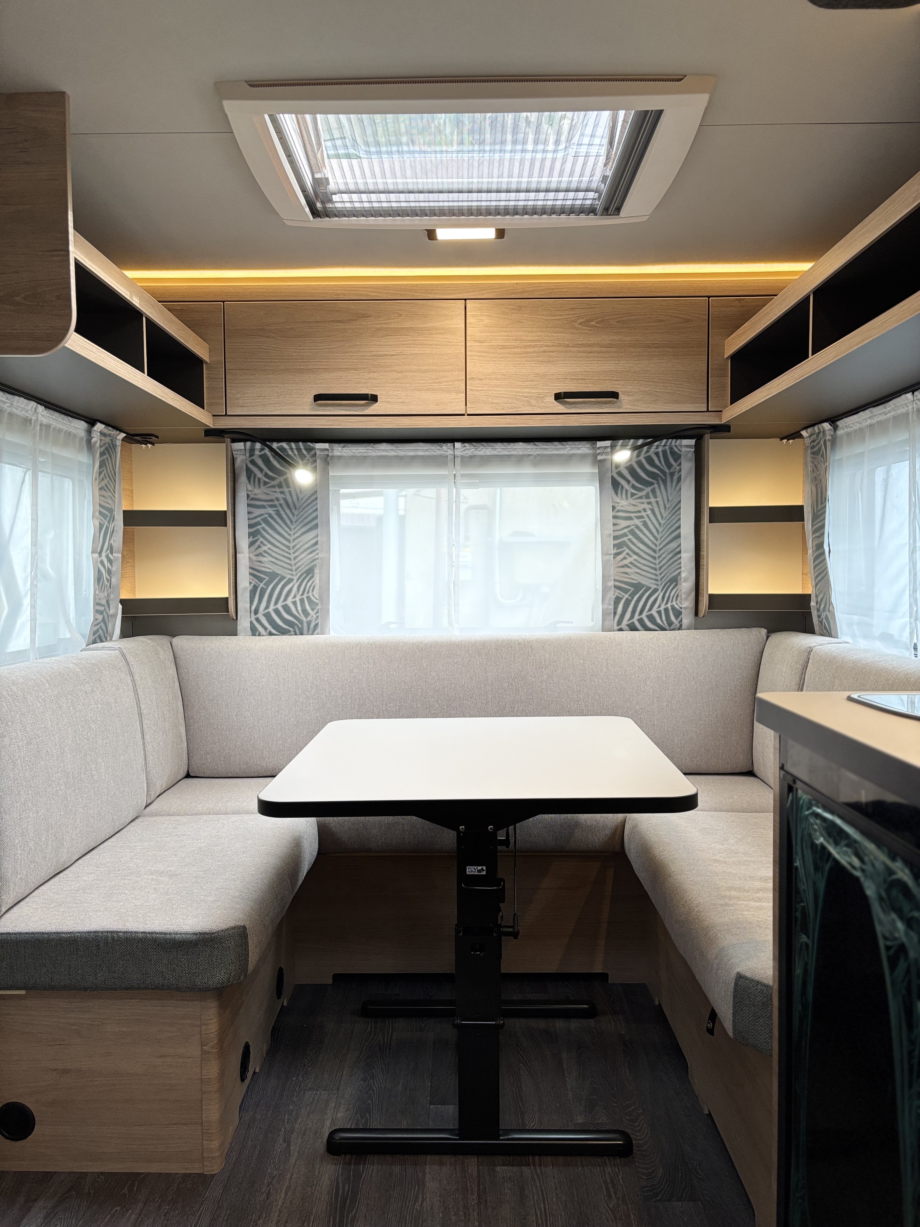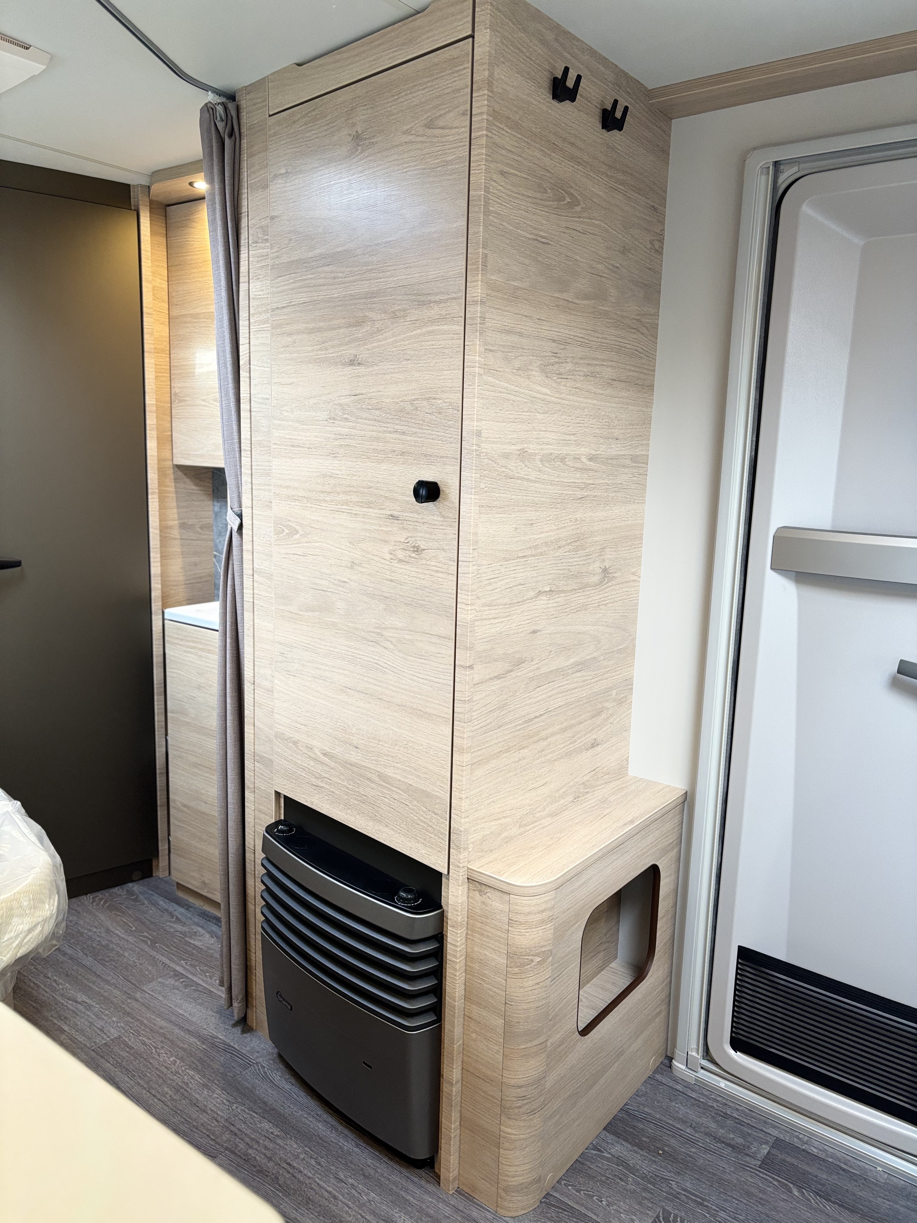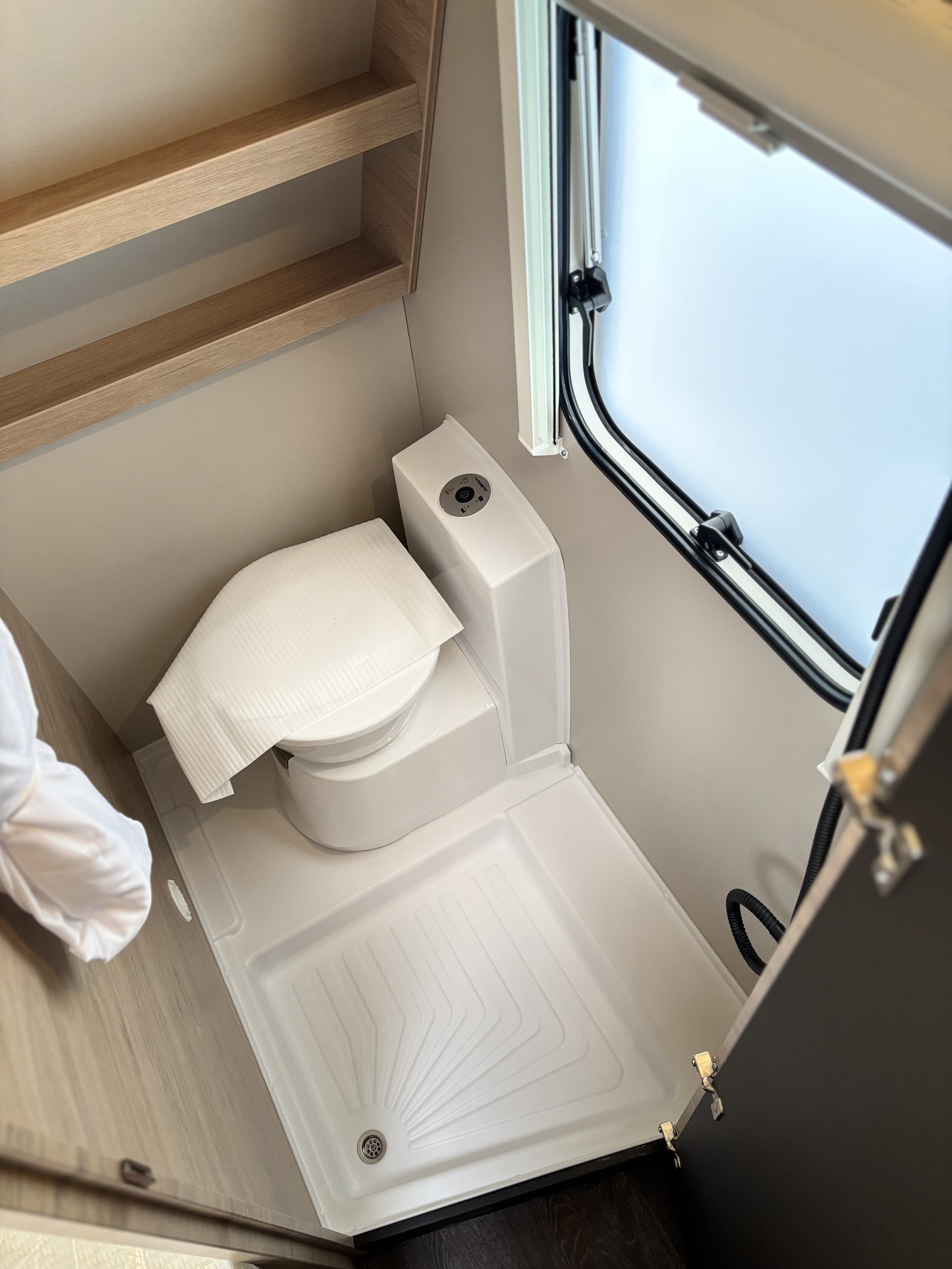Mosogató, Dometic 98 L-es hűtő, 3 égőfejes tűzhely, mosdófülke zuhanytálcával és beépített bio-Wc-vel, kombirolók, hideg-melegvíz rendszer, 45l-es beépített víztartály, 25l-es mobil szennyvíztartály, 40x40 cm-es panoráma tetőablak, EvoPore HRC matrac, Forest kárpitozás, olvasólámpa, gardróbszekrény, Truma gázfűtés S 3004,