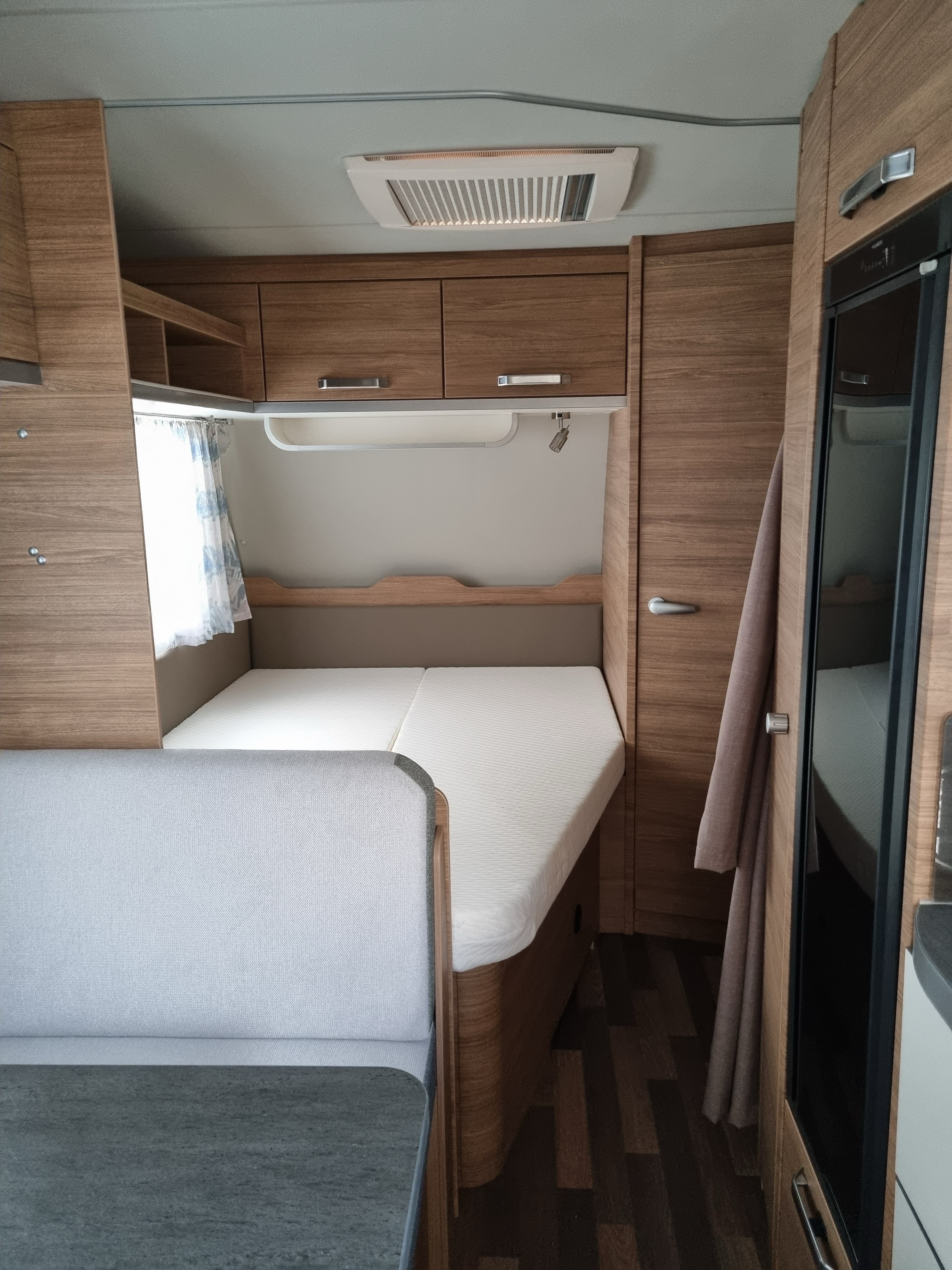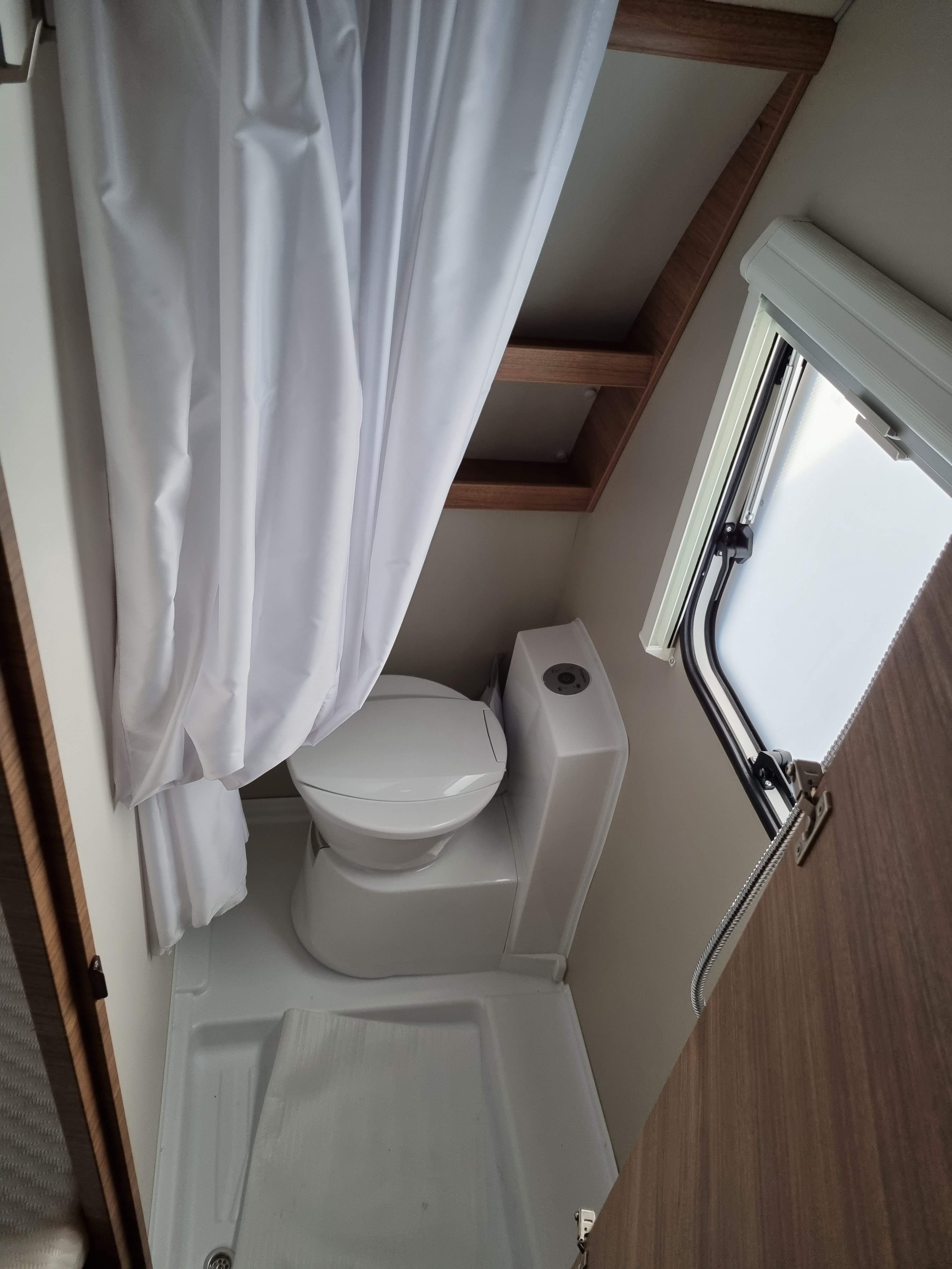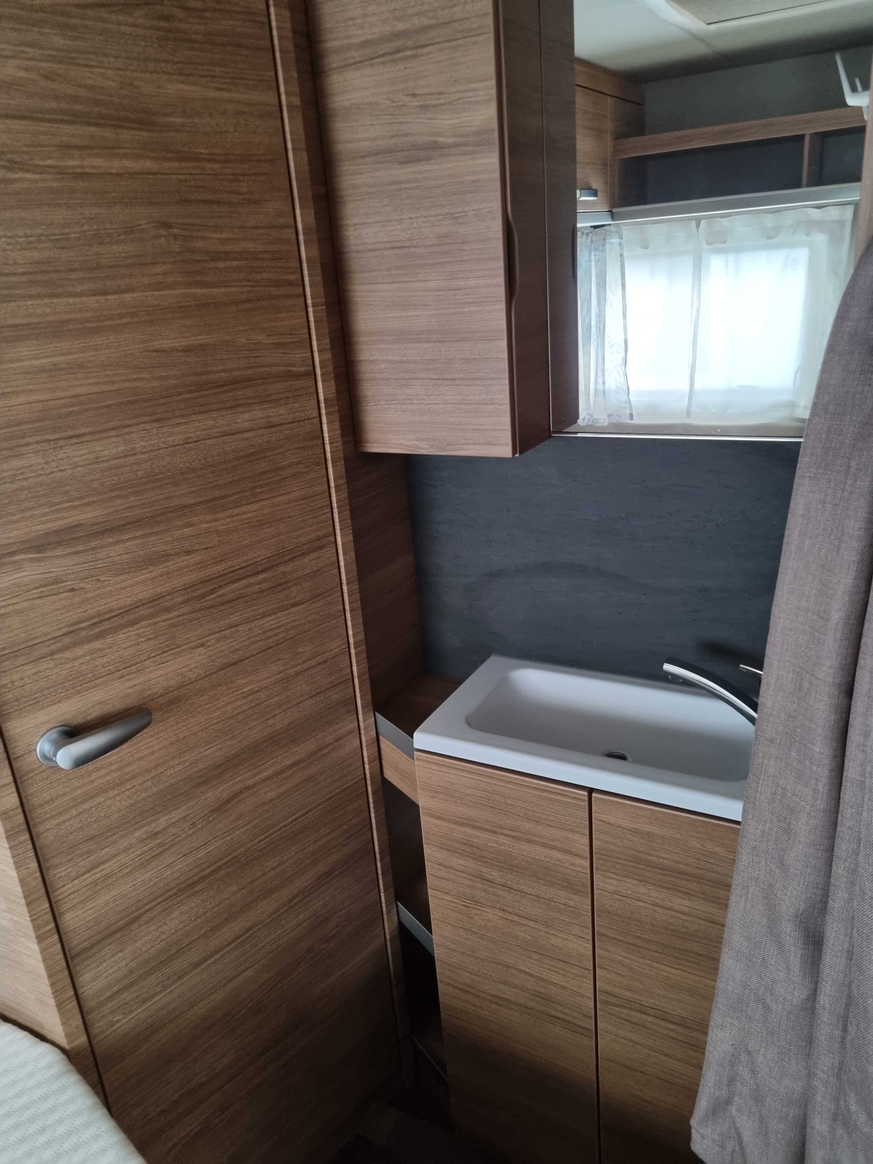 Mosogató,133L-es Thetford hűtő, tűzhely, 12V-os körfűtés, beépített mosdó, zuhanyfülke beépített bio Wc-vel, kombirolók, szúnyoghálós ajtó, térelválasztó függöny, hideg-meleg vízrendszer, beépített víztartály, 25l-es mobil szennyvíztartály, panoráma tetőablak, stabilizátoros vonófej.