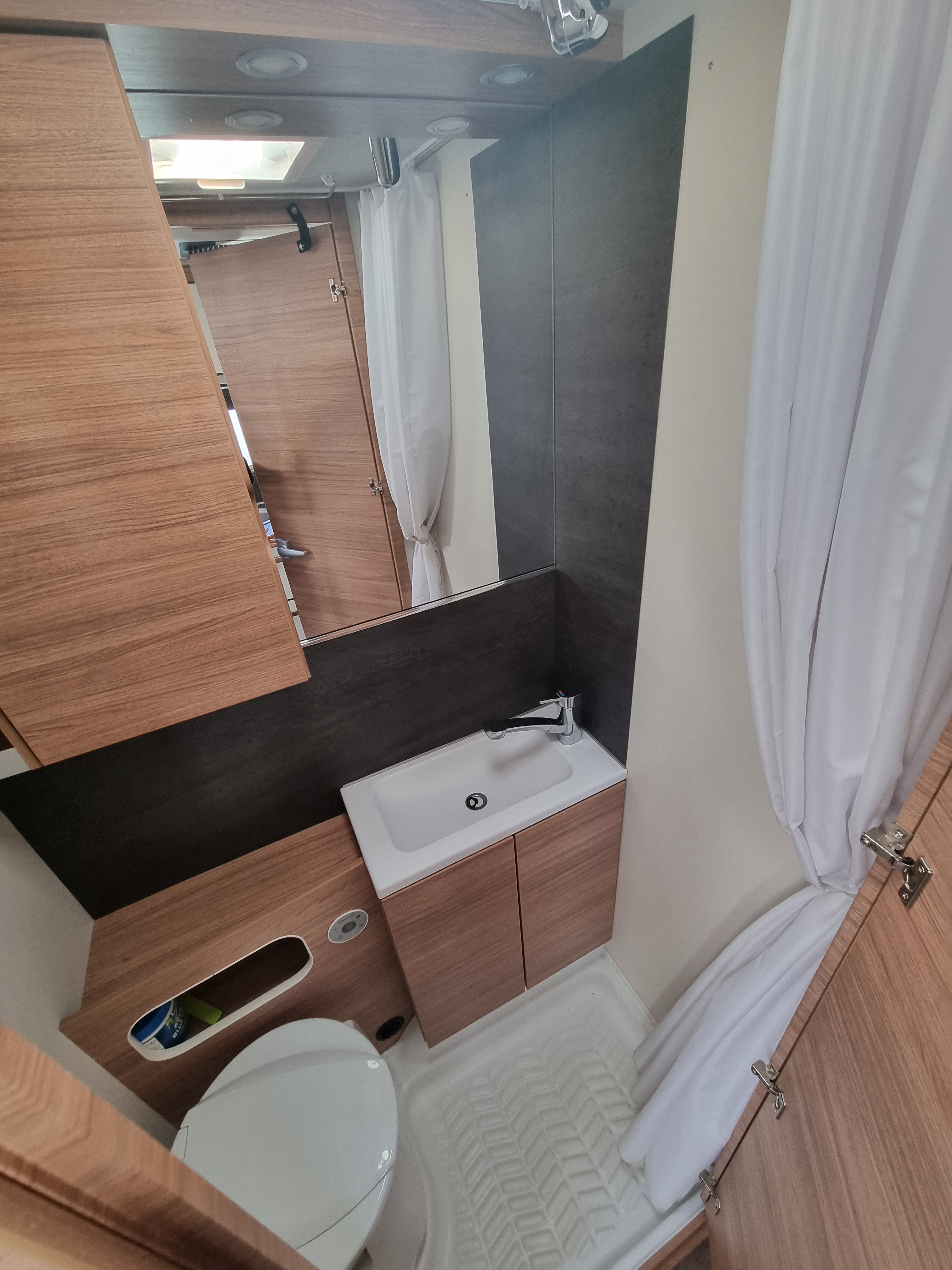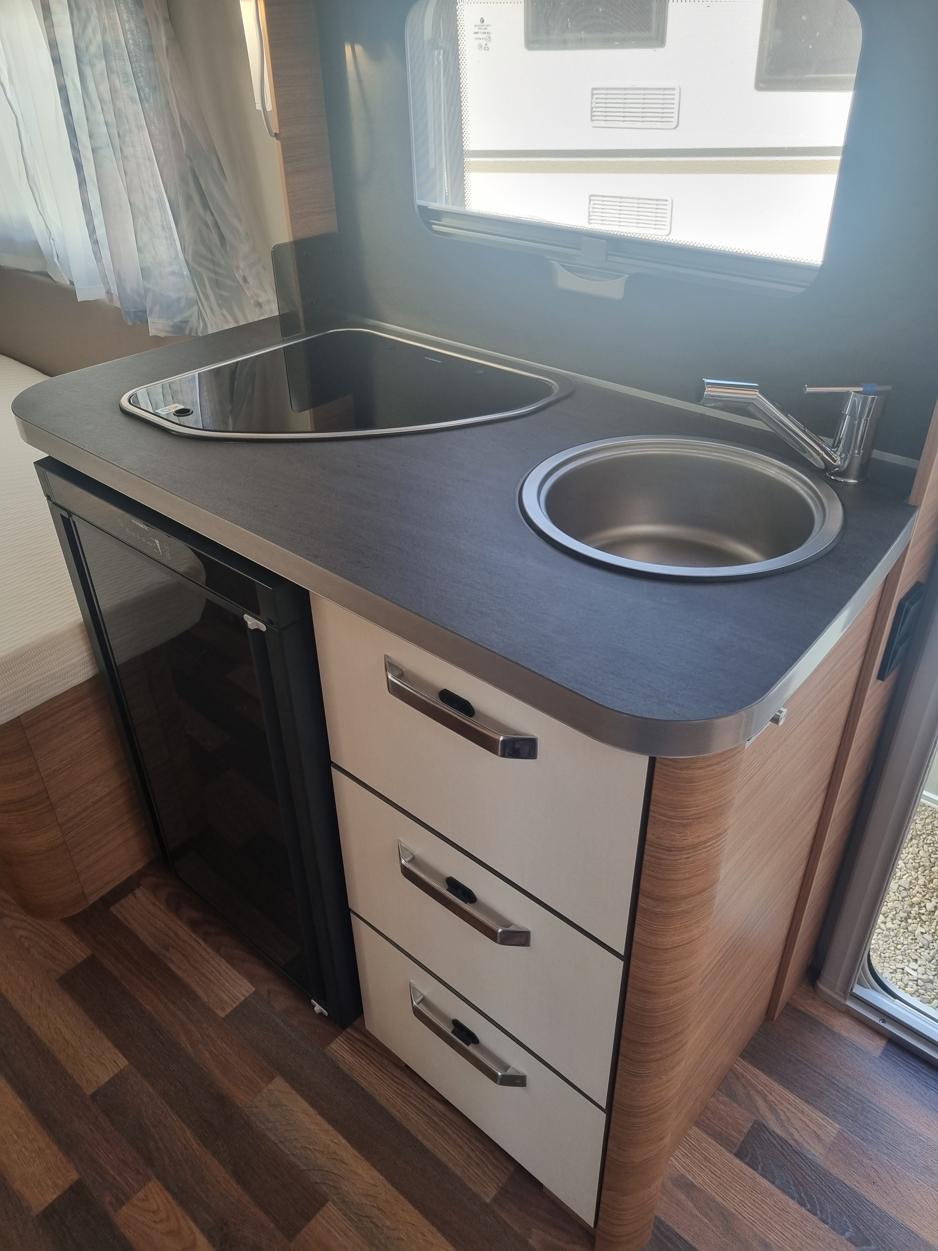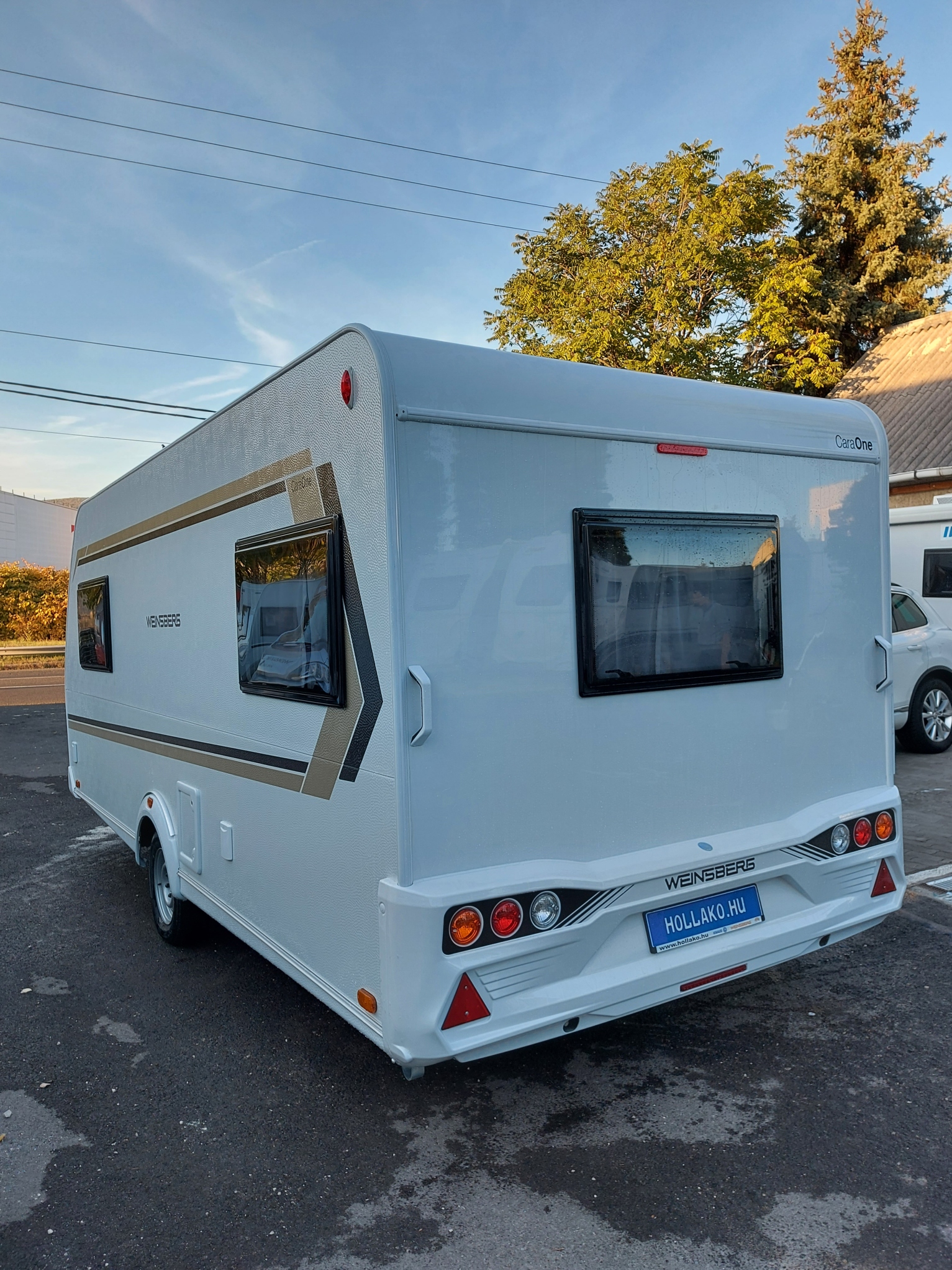 Mosogató, hűtő, tűzhely, 12V-os körfűtés, beépített mosdófülke zuhanytálcával és beépített bio-Wc-vel, kombirolók, hideg-melegvíz rendszer, 45l-es beépített víztartály, 25l-es mobil szennyvíztartály, panoráma tetőablak, stabilizátoros vonófej, szúnyoghálós ajtó.