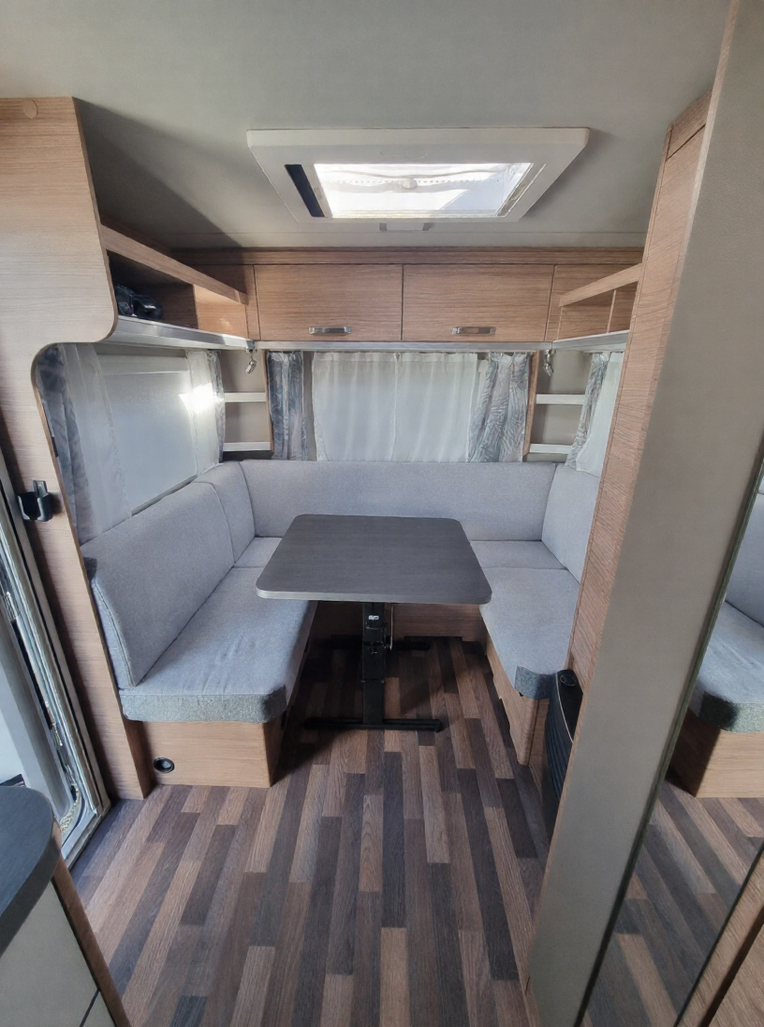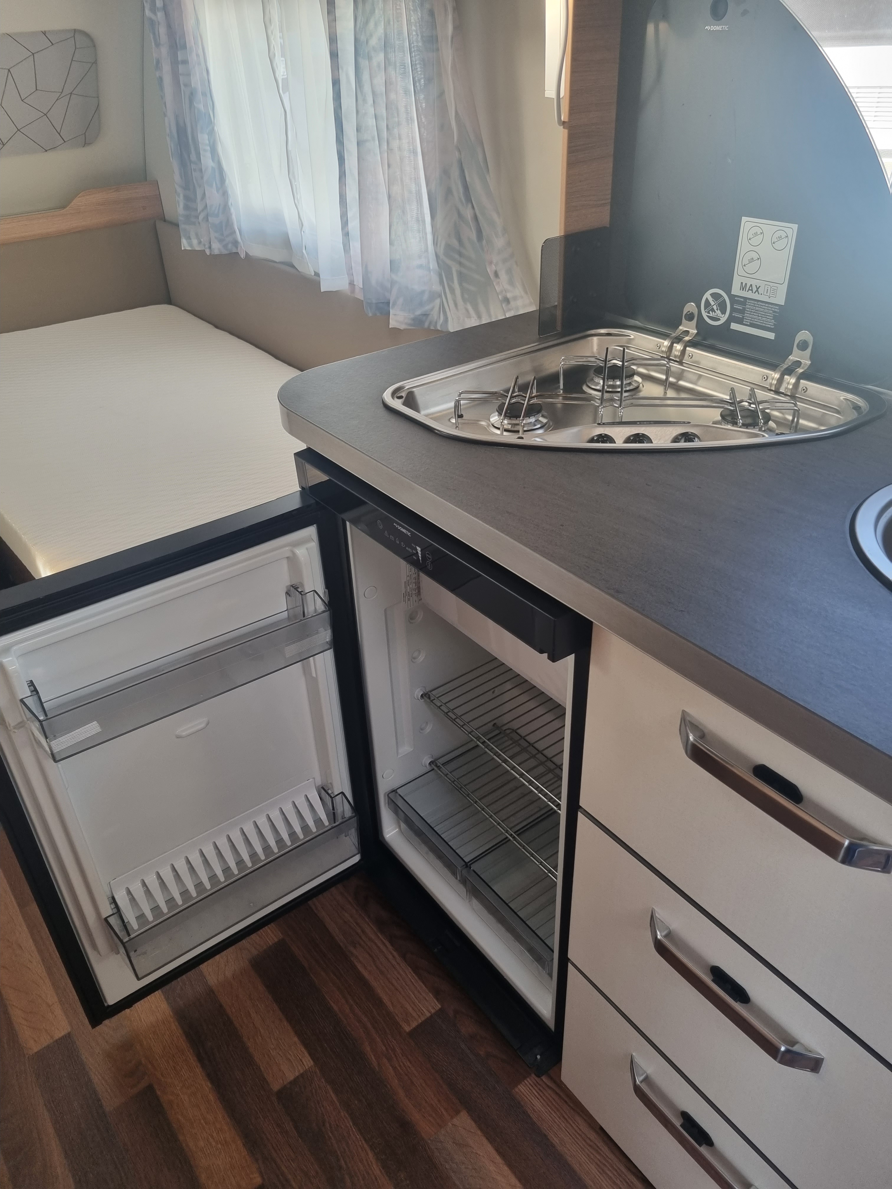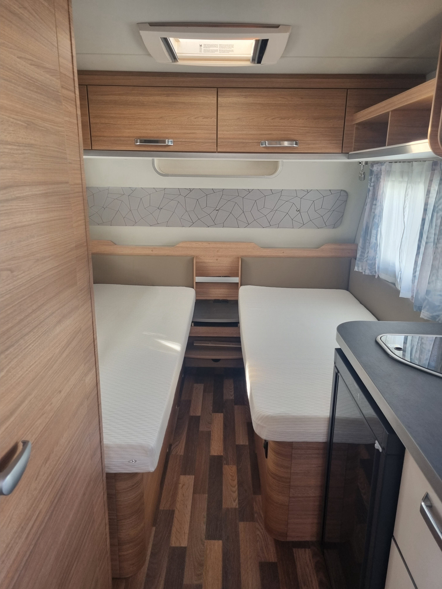 Mosogató, hűtő, tűzhely, 12V-os körfűtés, beépített mosdófülke zuhanytálcával és beépített bio-Wc-vel, kombirolók, hideg-melegvíz rendszer, 45l-es beépített víztartály, 25l-es mobil szennyvíztartály, panoráma tetőablak, stabilizátoros vonófej, szúnyoghálós ajtó.