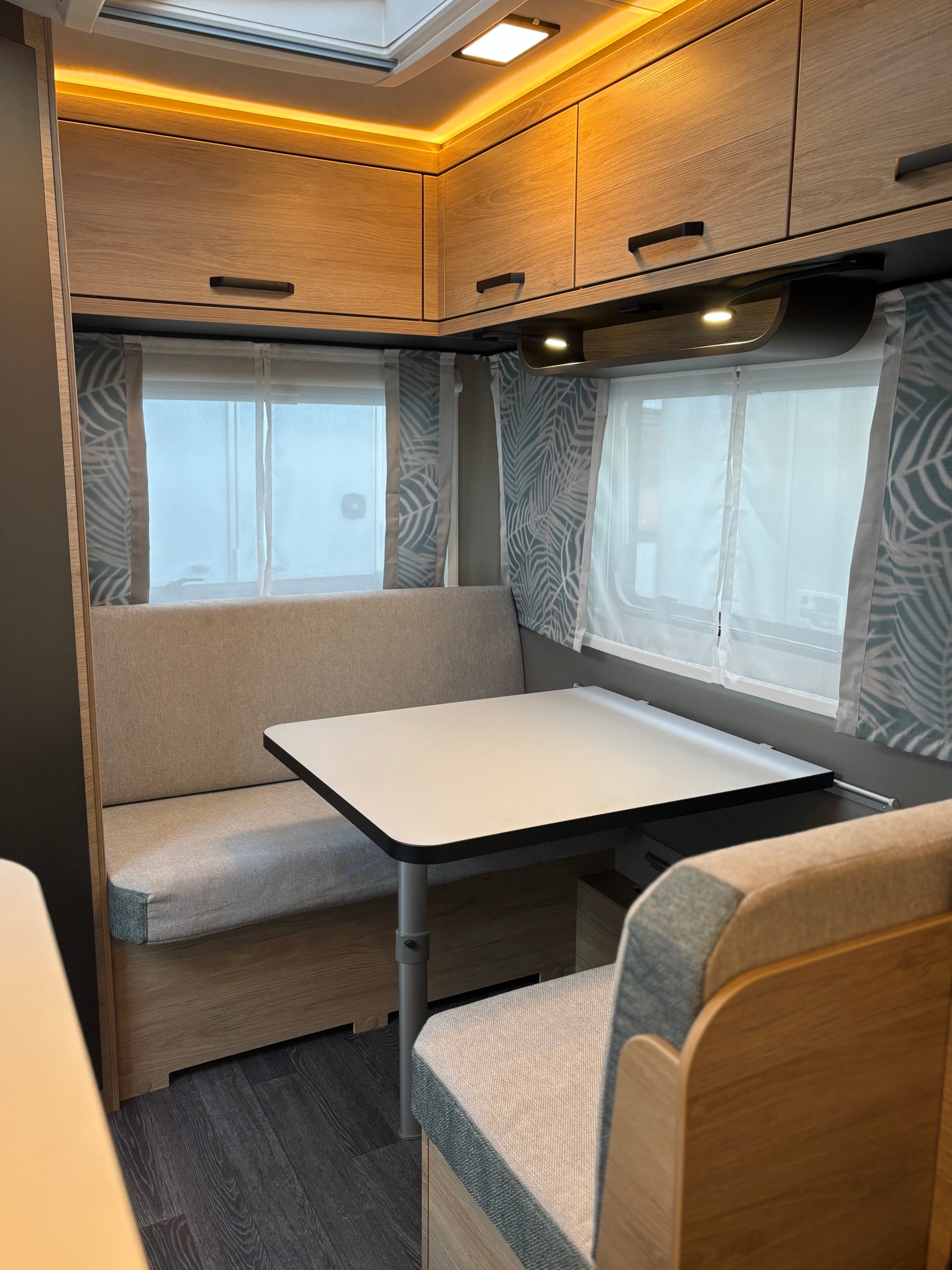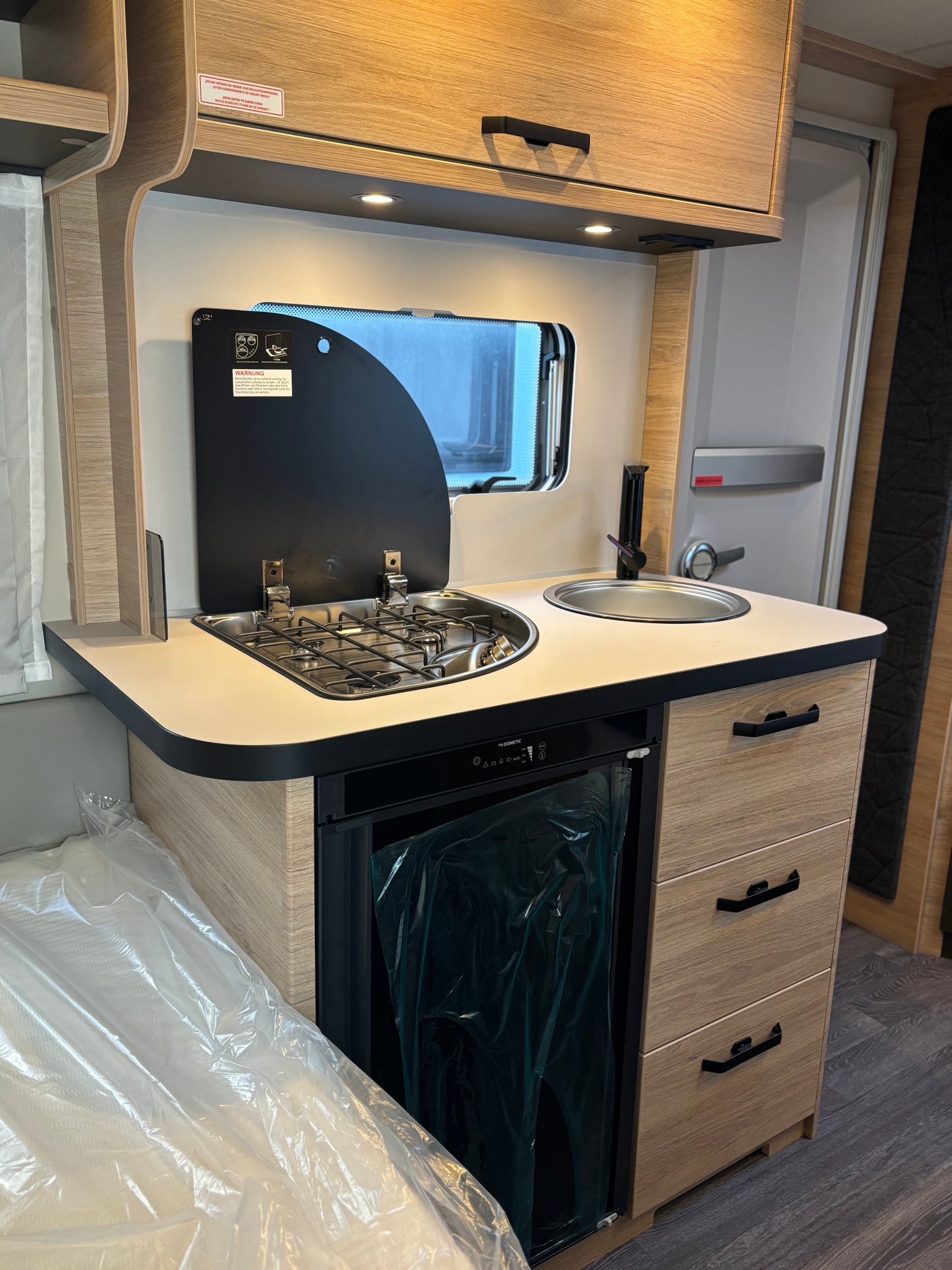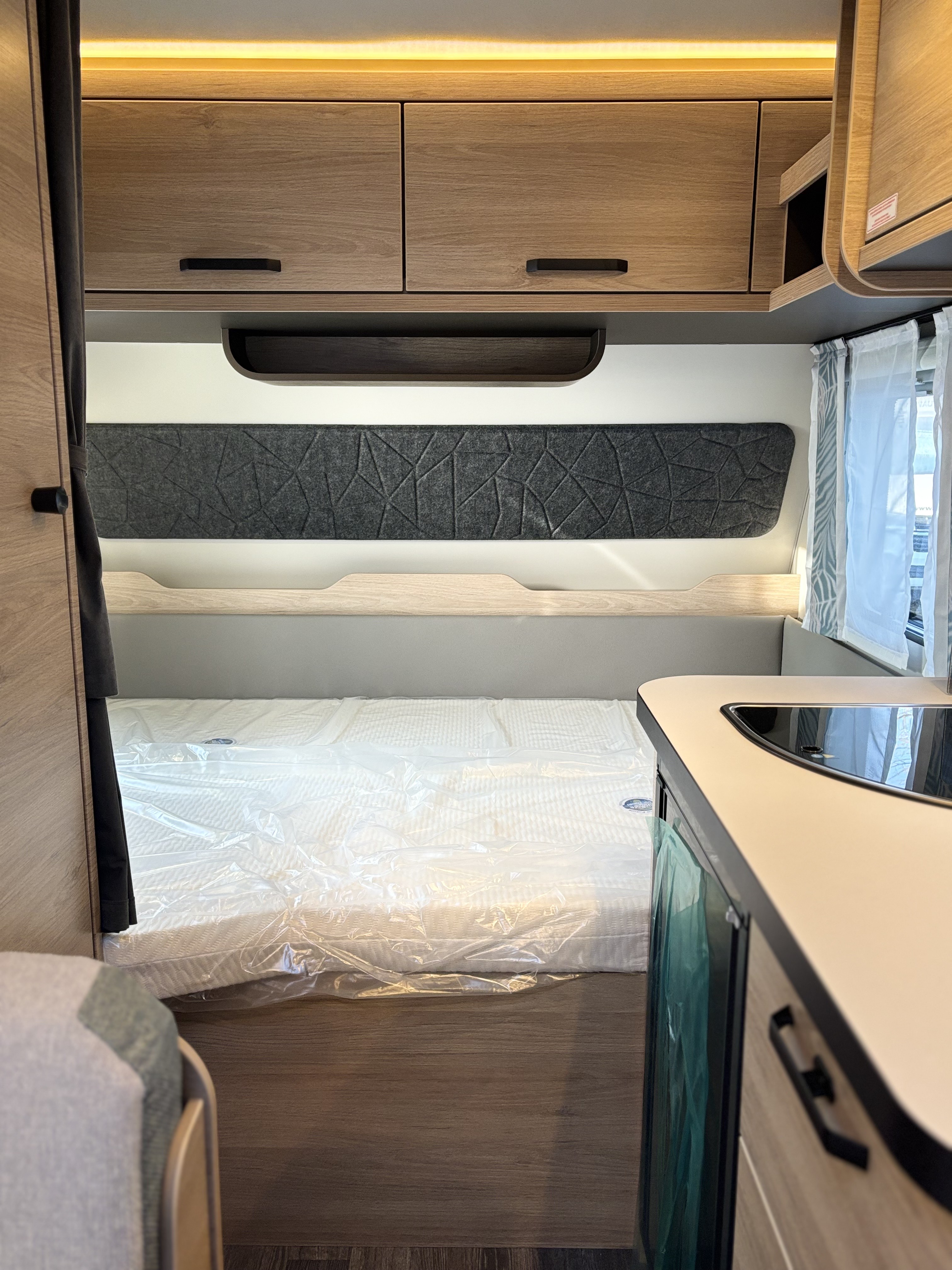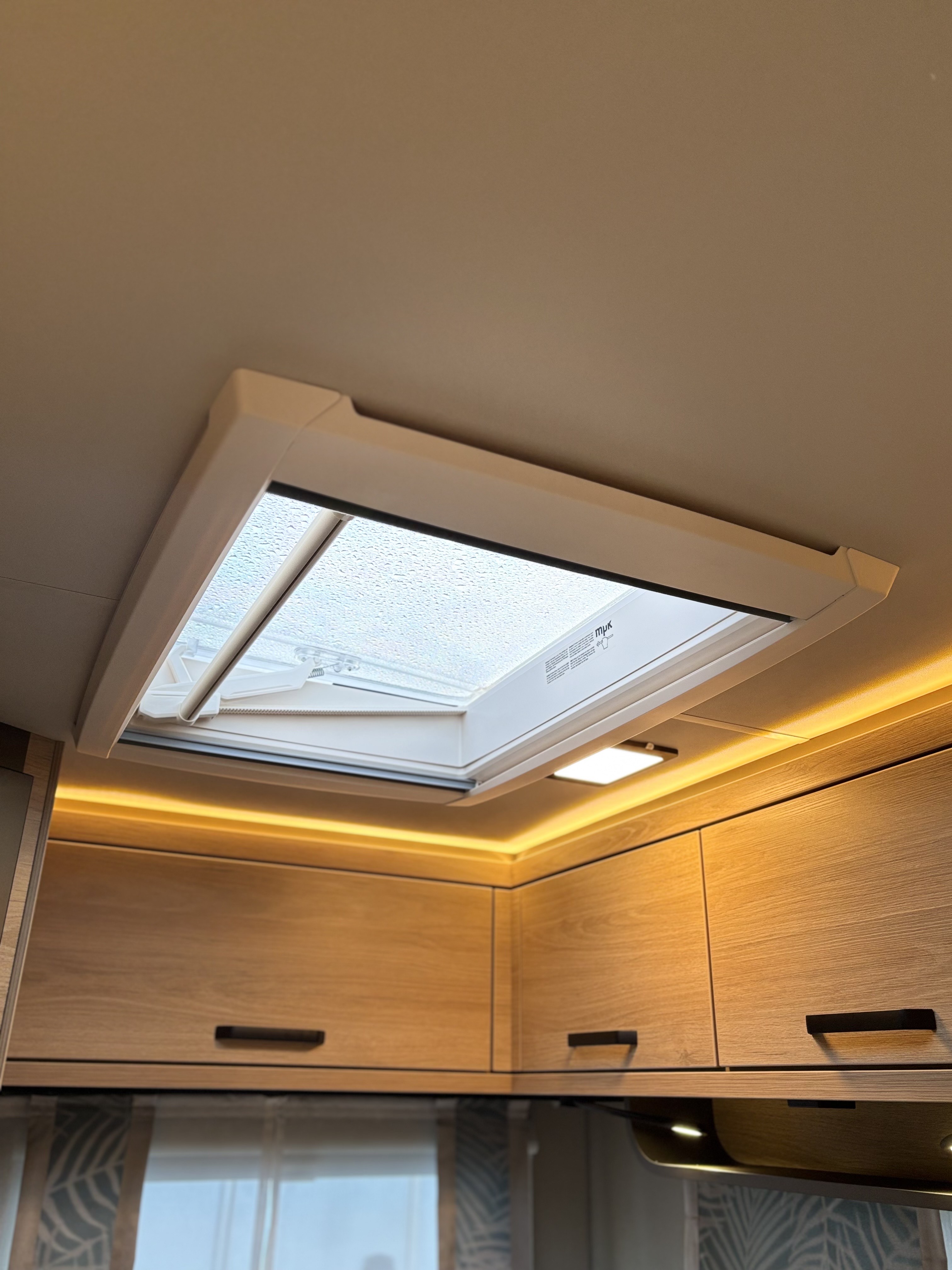 Mosogató, 98 L-es hűtő, 3 égőfejes tűzhely, 12V-os körfűtés, beépített mosdófülke zuhanytálcával és beépített bio-Wc-vel, hideg-meleg vízrendszer, 45 l-es beépített víztartály, 25l-es mobil szennyvíztartály, 28 cm x 28 cm panoráma tetőablak, kombirolók, EvoPore HRC matrac, Truma S 3004 gázfűtés