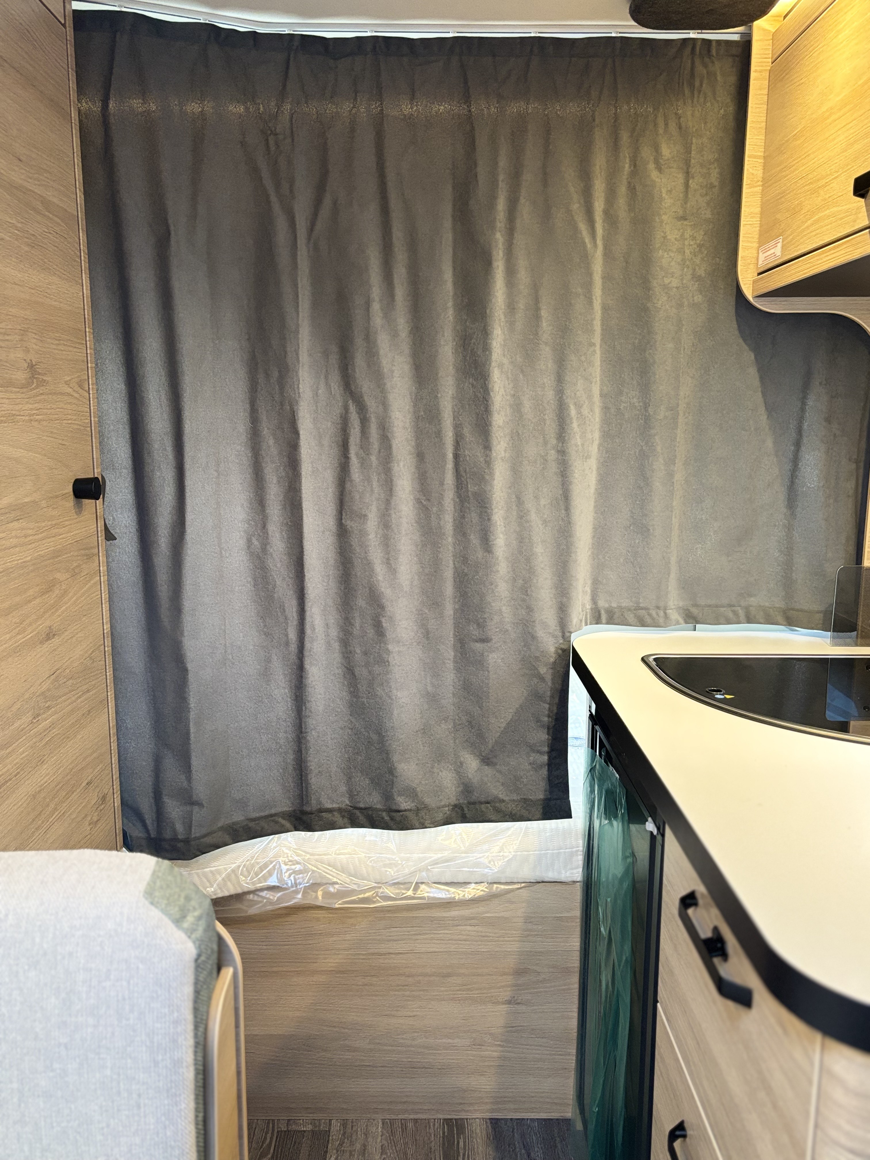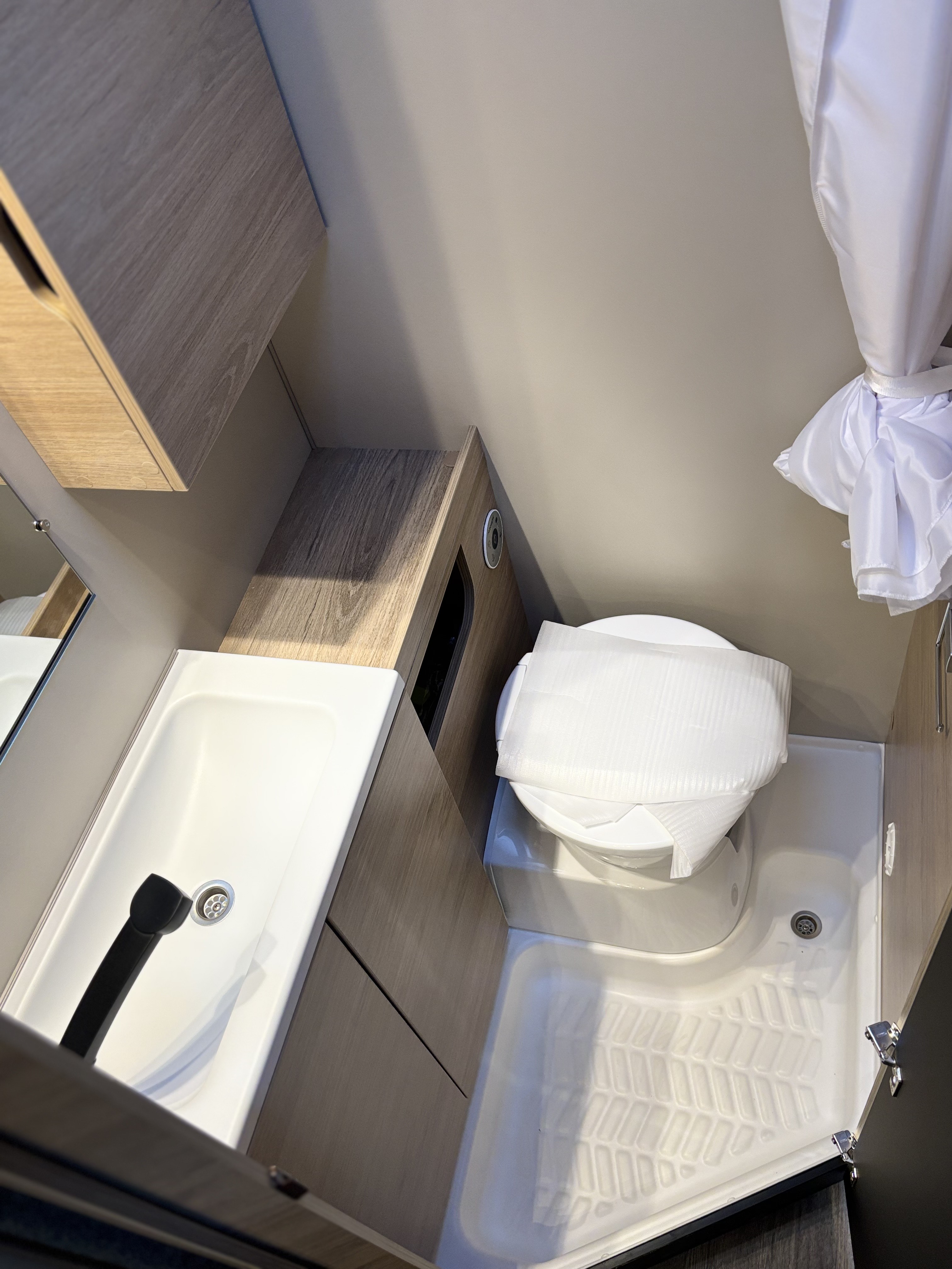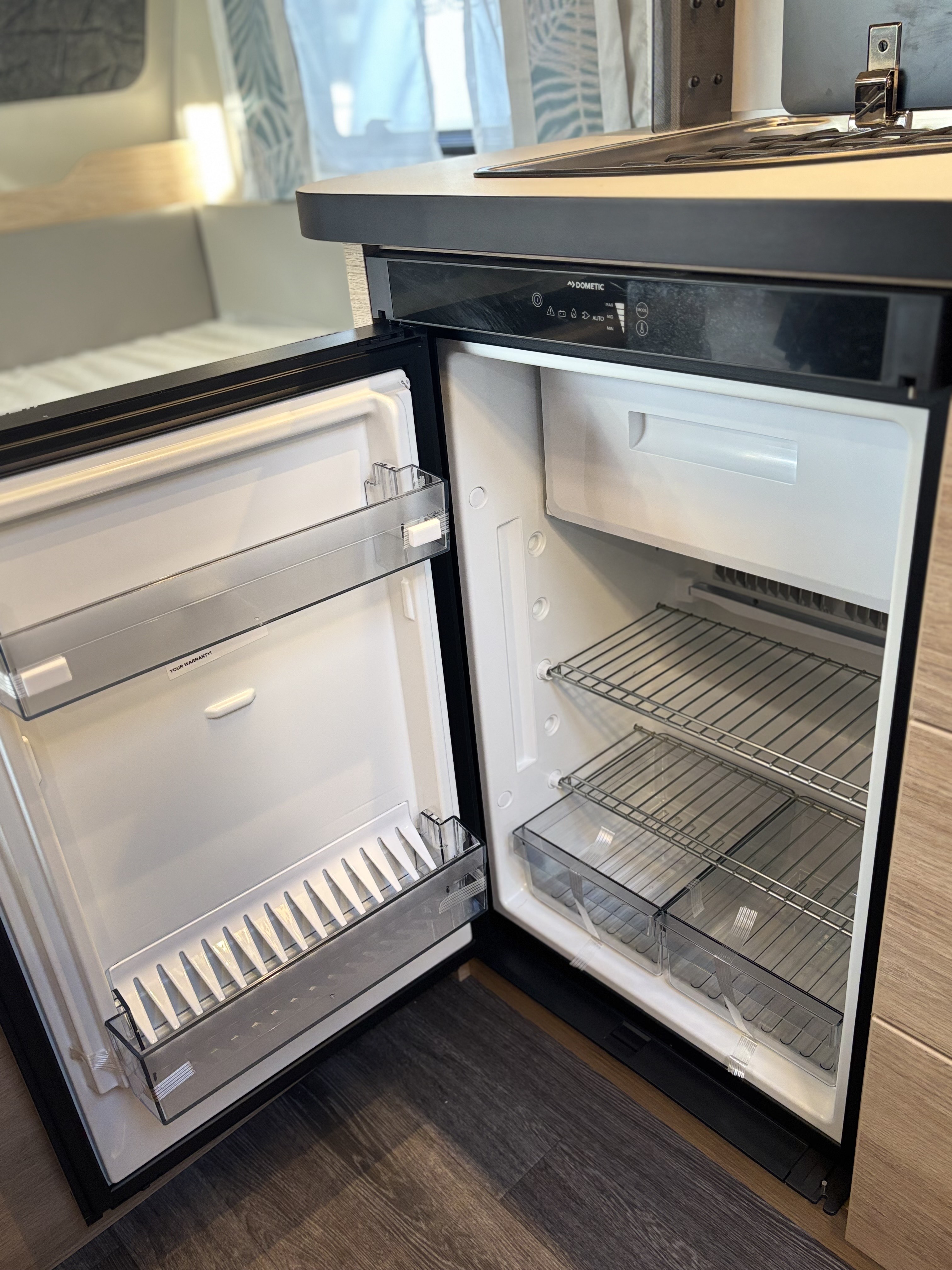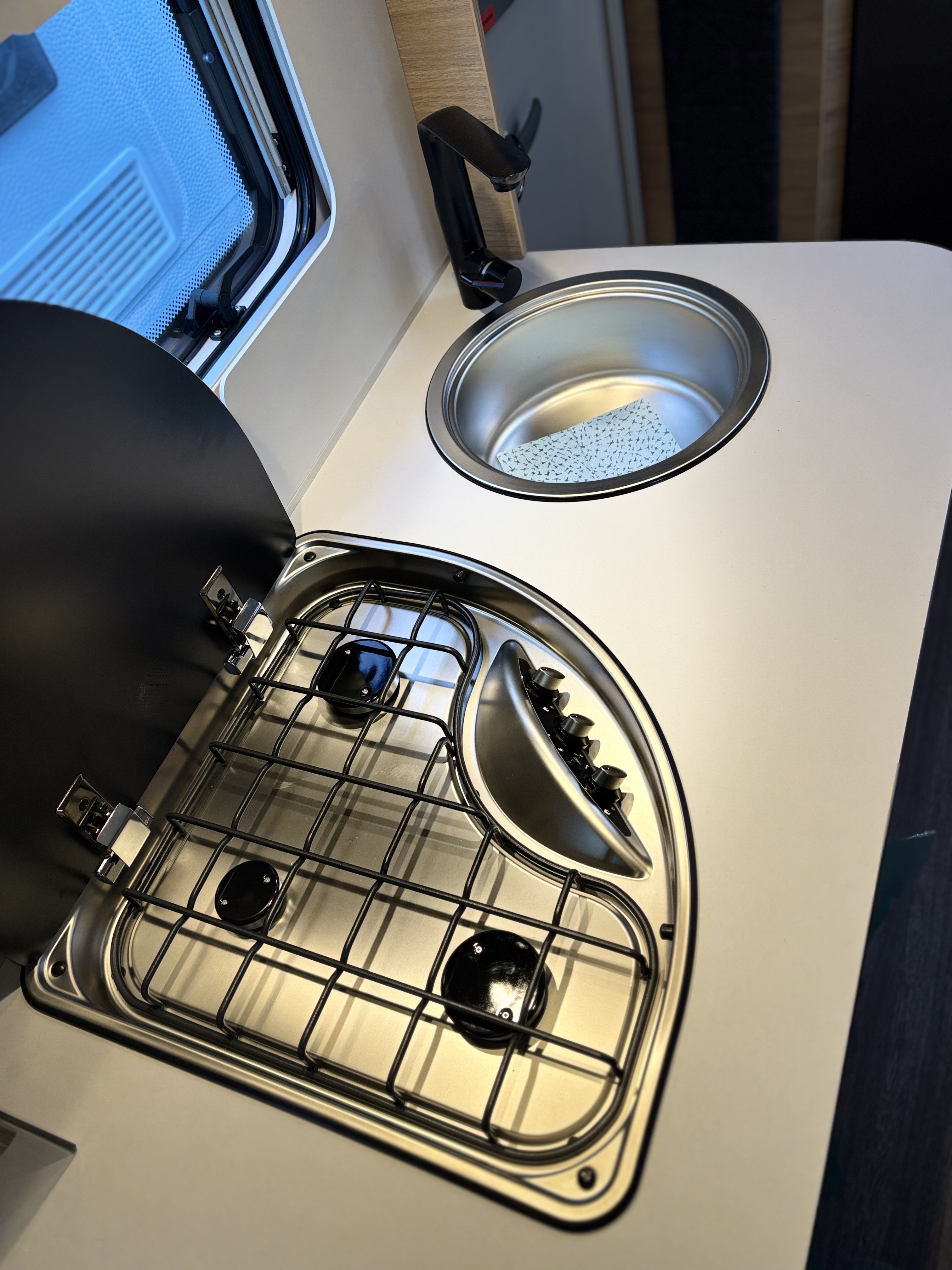 Mosogató, 98 L-es hűtő, 3 égőfejes tűzhely, 12V-os körfűtés, beépített mosdófülke zuhanytálcával és beépített bio-Wc-vel, hideg-meleg vízrendszer, 45 l-es beépített víztartály, 25l-es mobil szennyvíztartály, 28 cm x 28 cm panoráma tetőablak, kombirolók, EvoPore HRC matrac, Truma S 3004 gázfűtés