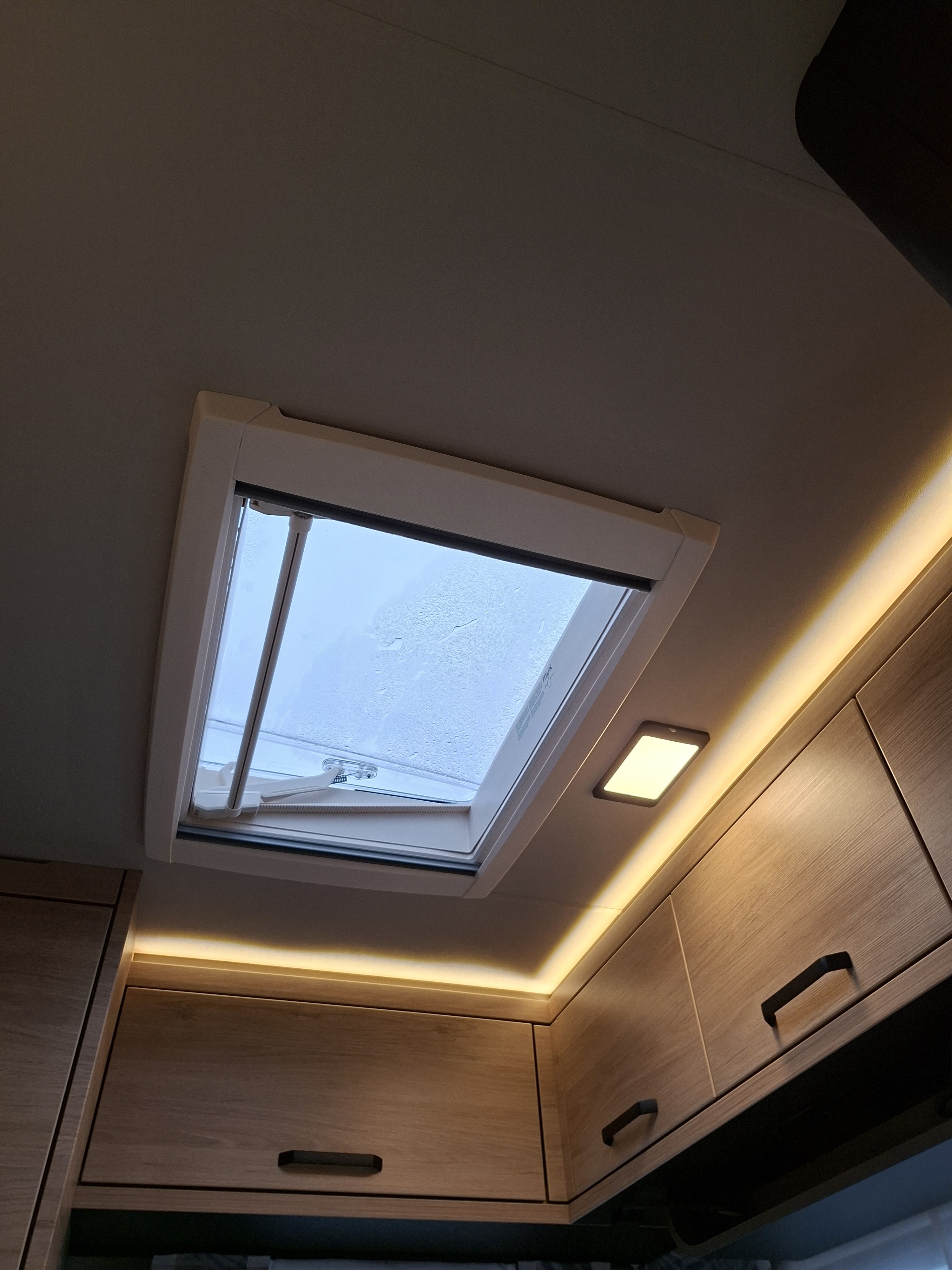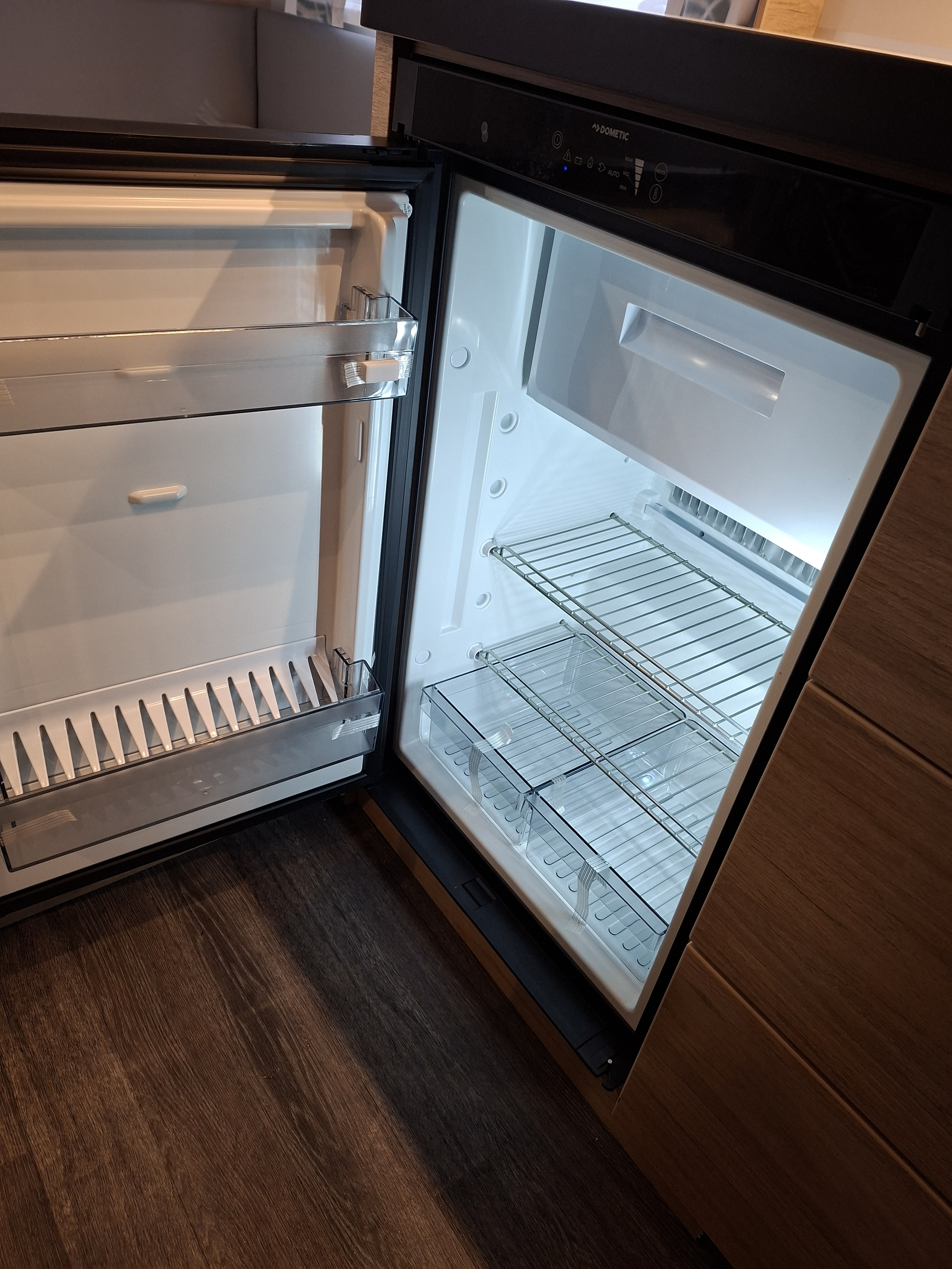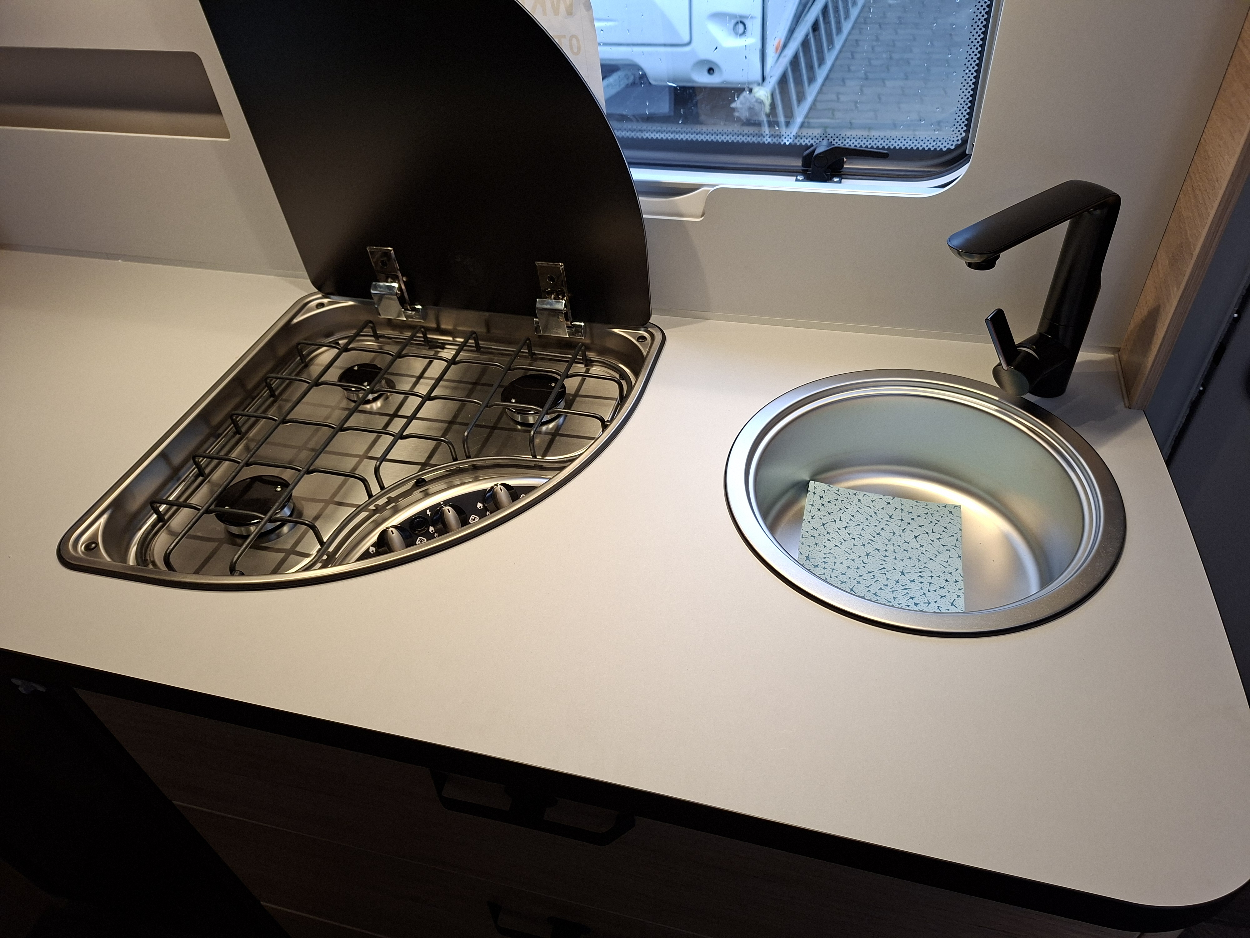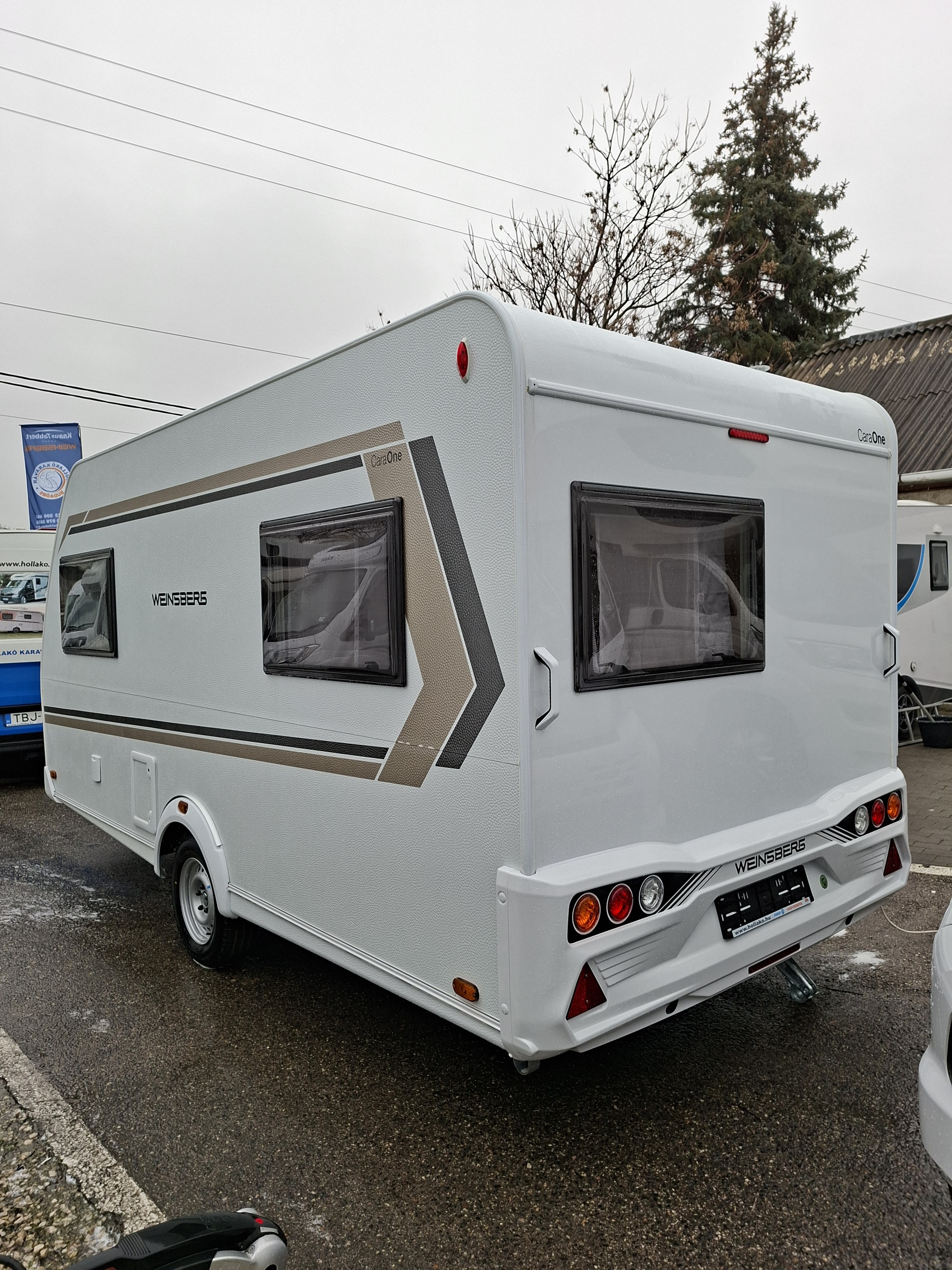 Mosogató, hűtő, tűzhely, 12V-os körfűtés, beépített mosdófülke zuhanytálcával és beépített bio wc-vel, kombirolók, szúnyoghálós ajtó, hideg-meleg vízrendszer, 45l-es beépített víztartály, 25l-es mobil szennyvíztartály, panoráma tetőablak, stabilizátoros vonófej