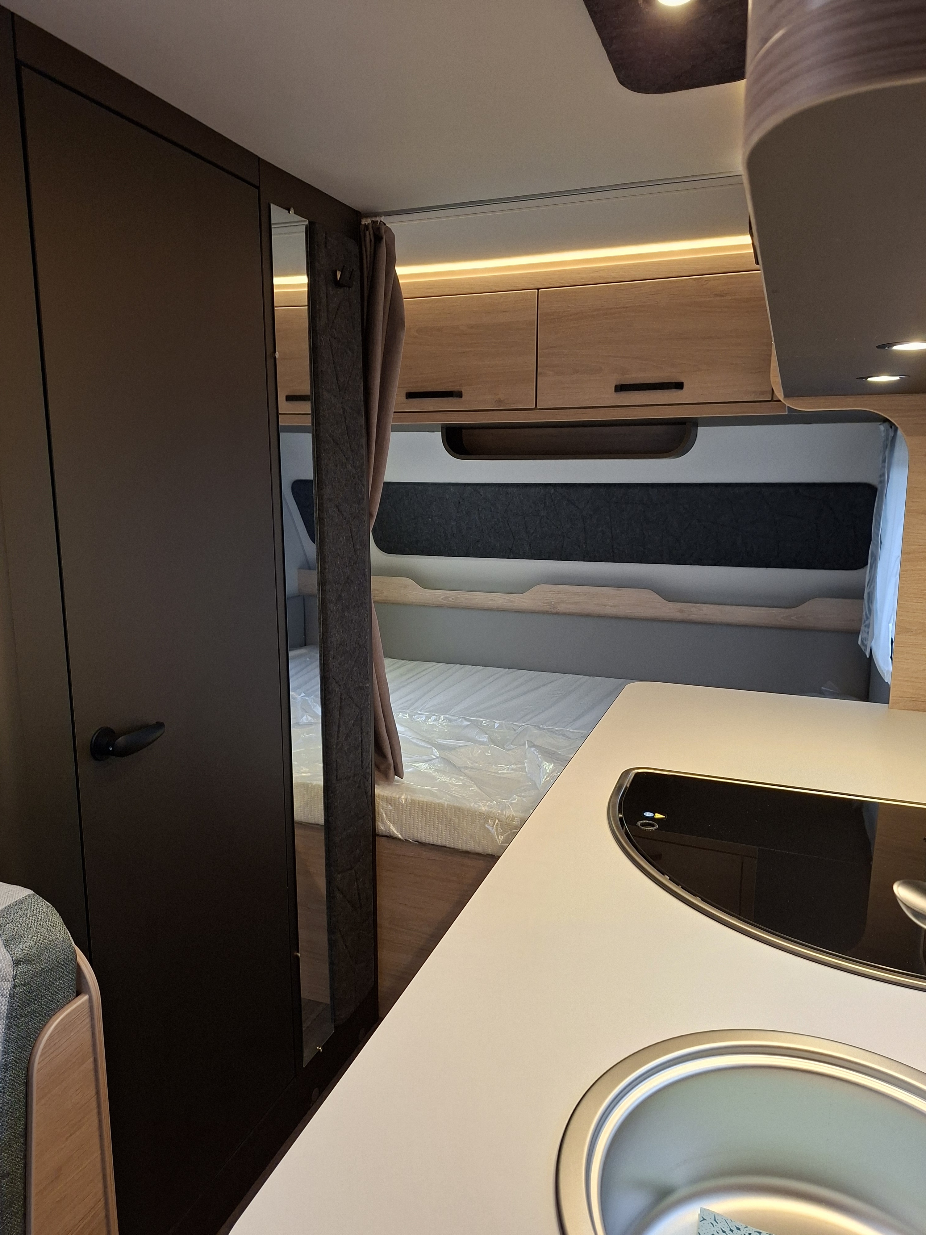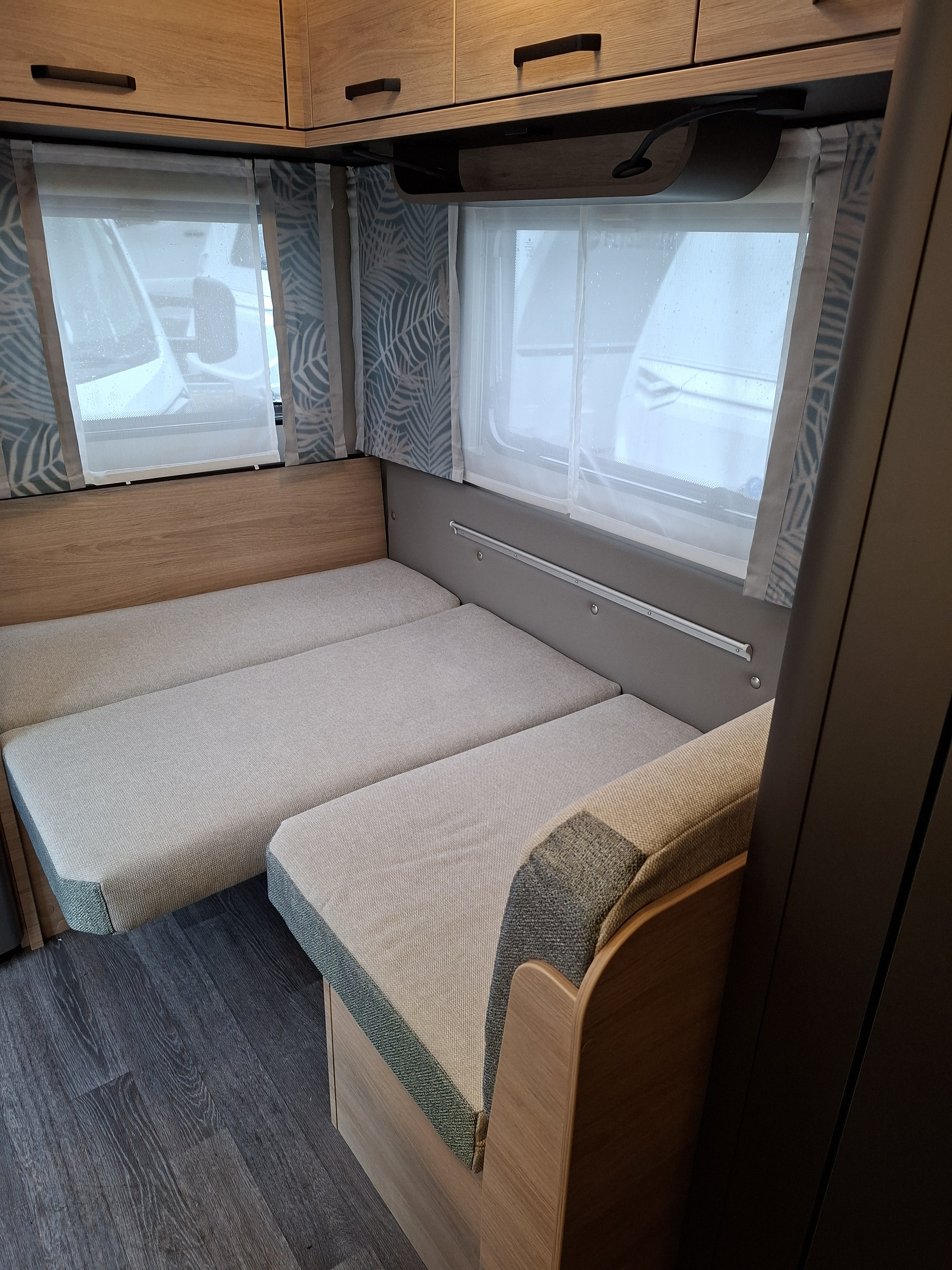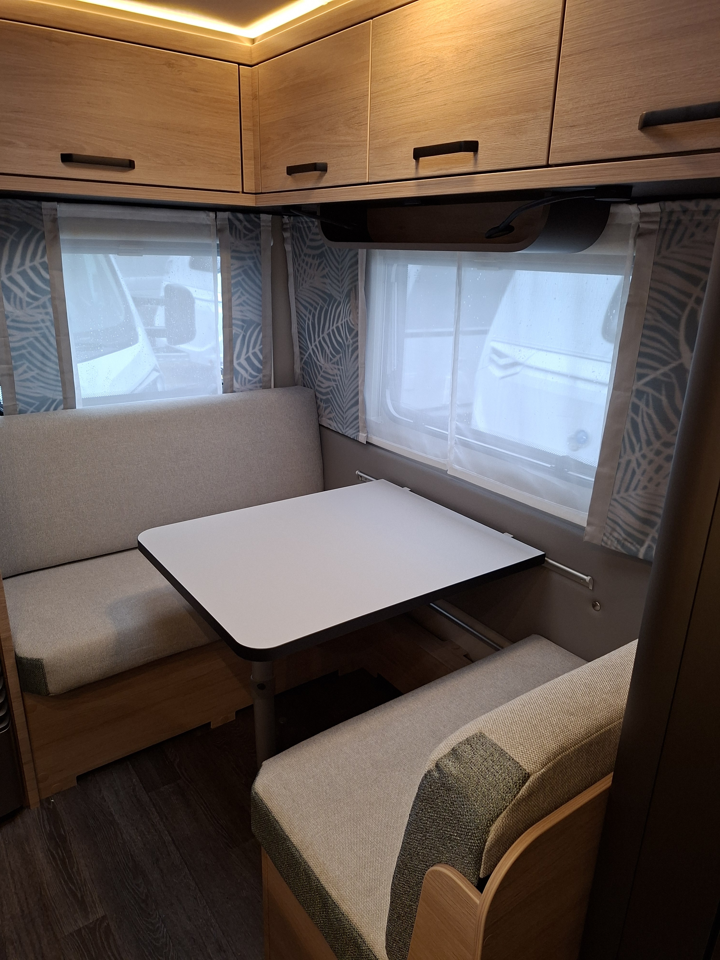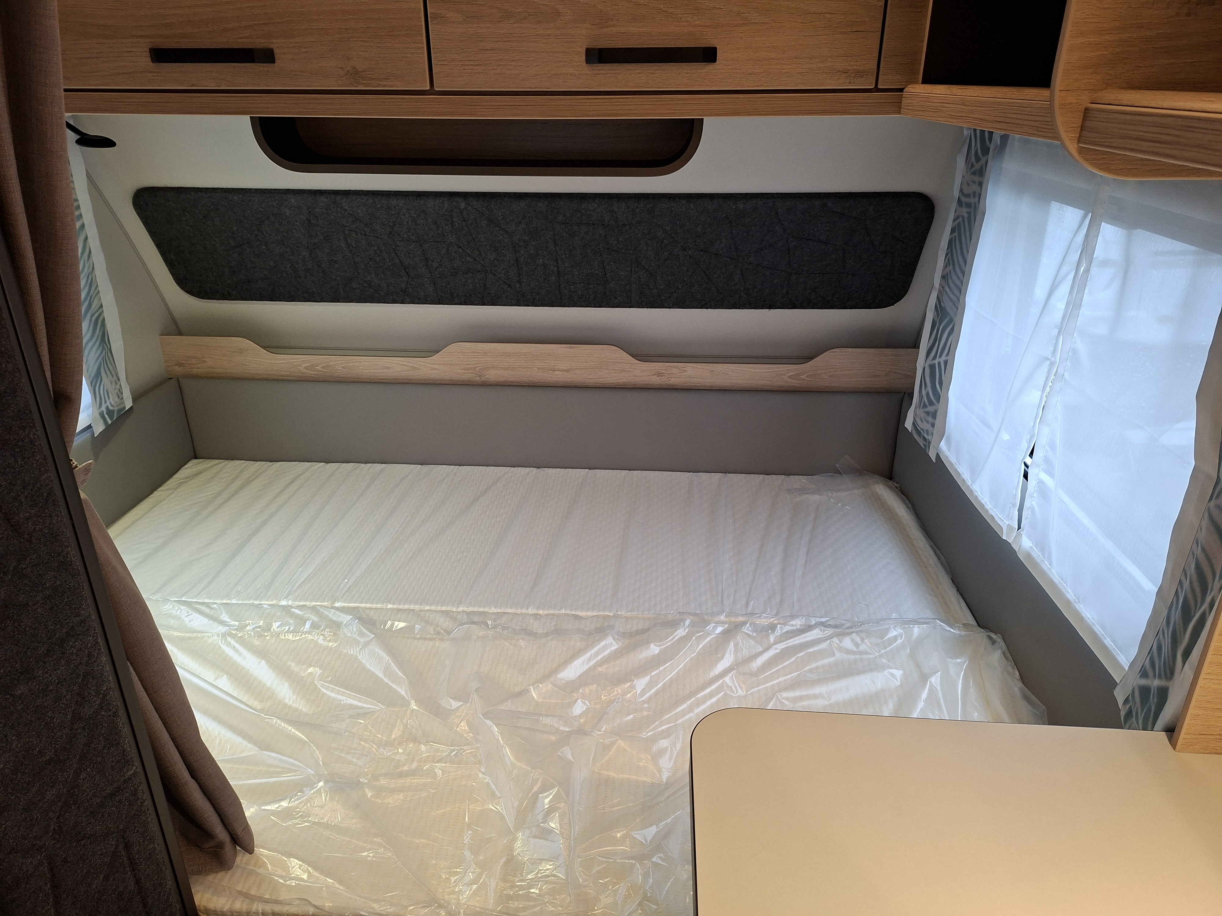 Mosogató, hűtő, tűzhely, 12V-os körfűtés, beépített mosdófülke zuhanytálcával és beépített bio wc-vel, kombirolók, szúnyoghálós ajtó, hideg-meleg vízrendszer, 45l-es beépített víztartály, 25l-es mobil szennyvíztartály, panoráma tetőablak, stabilizátoros vonófej